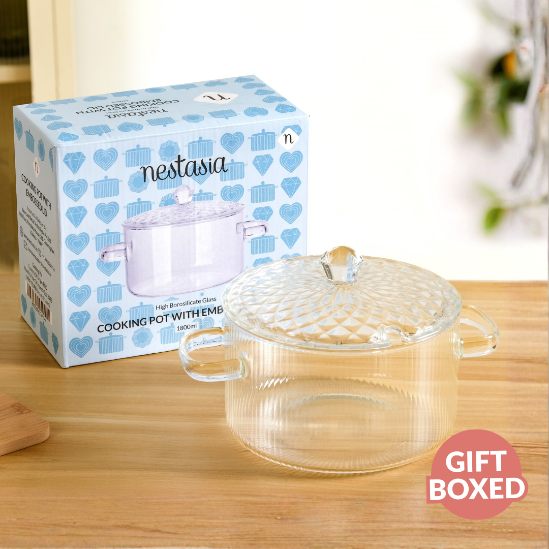 Benefits: The cooking pot is flame safe for stovetop use (always with liquid inside) and fridge safe, allowing you to cook, store, and reheat all in one vessel. The glass is naturally odourless & stain-free, ensuring pure, untainted flavours. It is also completely non-toxic & lead-free. For ultimate convenience, the pot is also microwave and dishwasher-safe, making cleanup fast and easy.