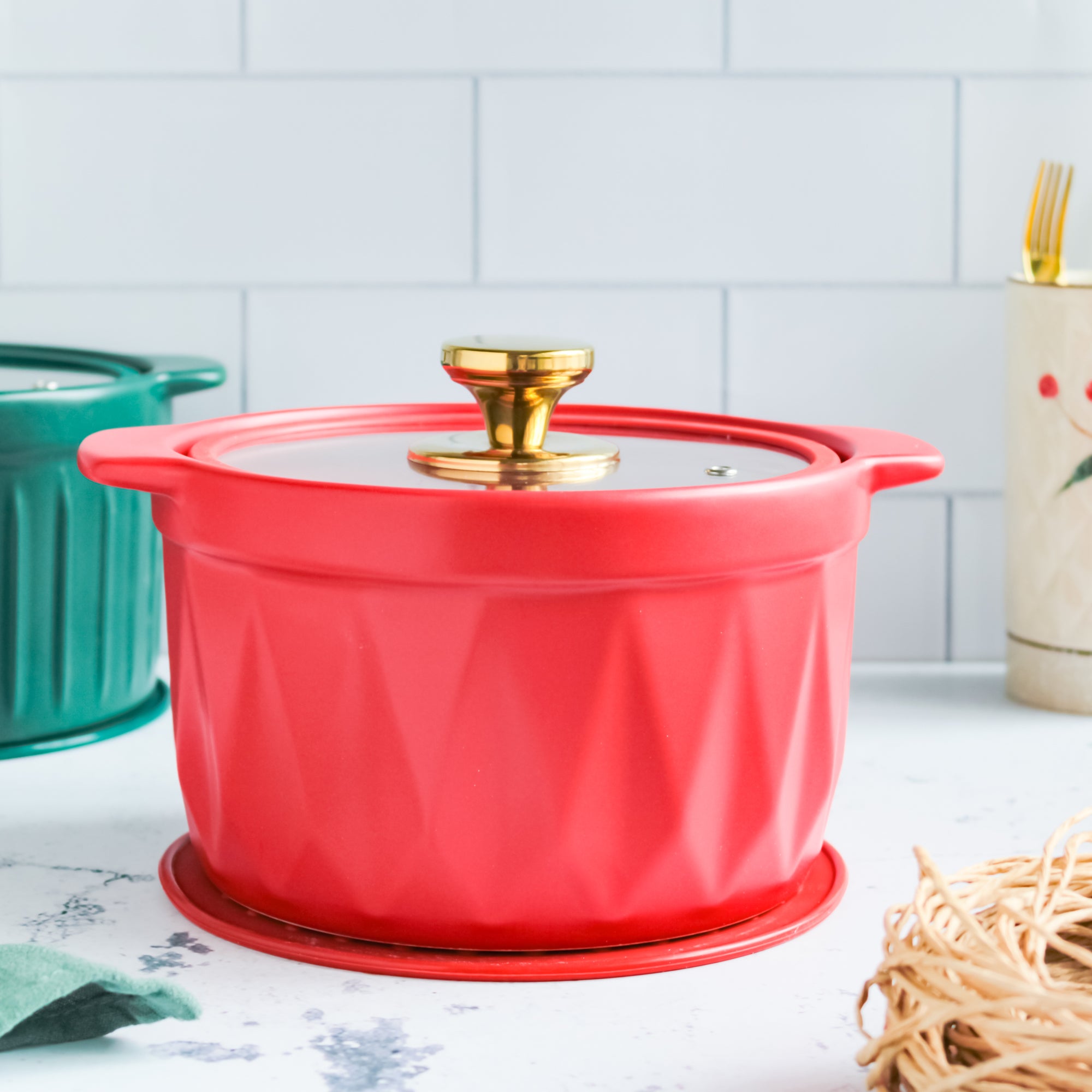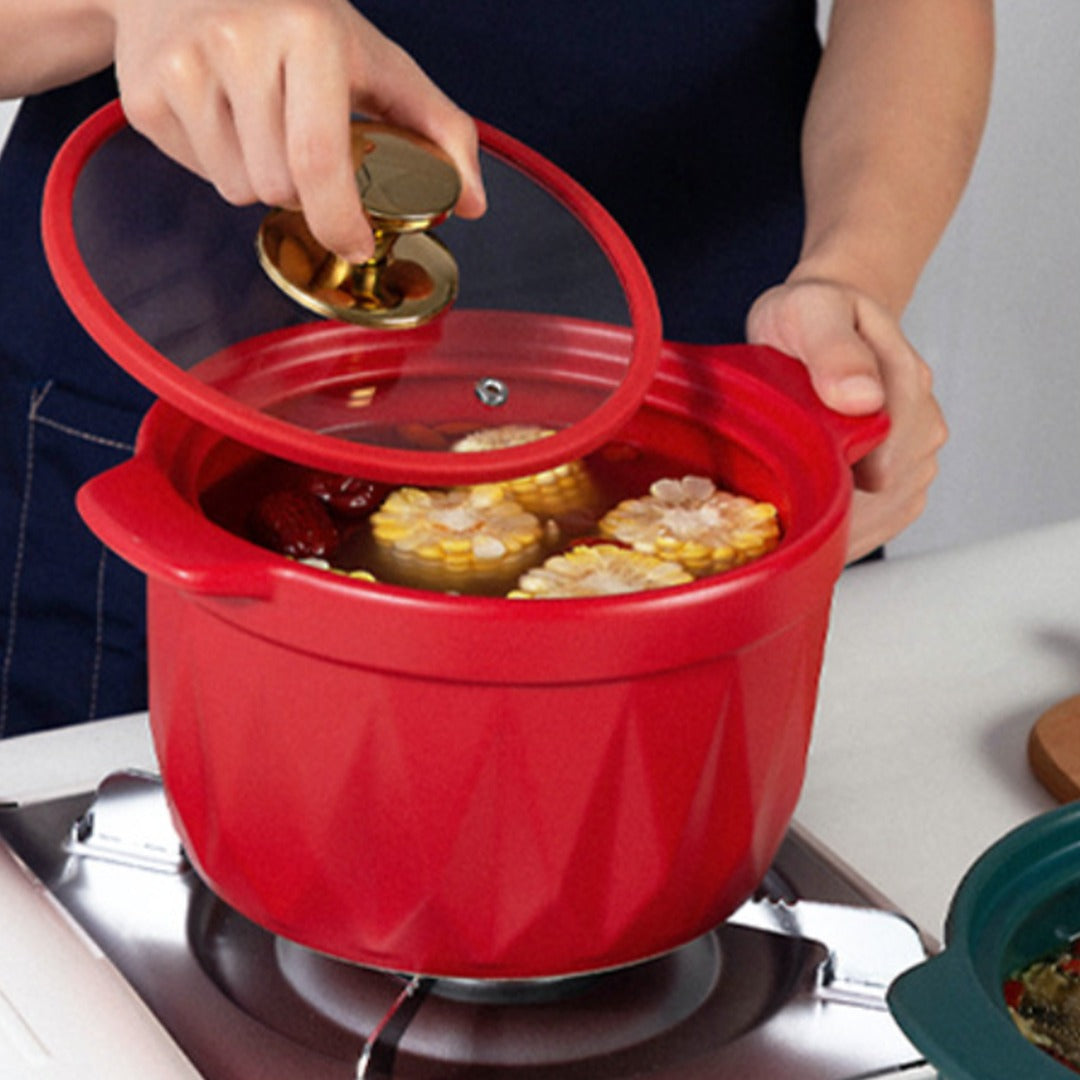 Cooking pot or casserole with easy to use handles and transparent lid is a must-add to any kitchen collection. The ceramic casserole has a diamond motif texture on the outer surface. The ceramic stew pot can be used to cook rice, lentils, meat and gravy or can be used for baking dishes. The stock pot comes with a matching table coaster or trivet to protect the table from heat when placed on it. The red cooking pot can be used to cook on the flame and is microwave friendly, while the casserole can also double up as a serving pot.