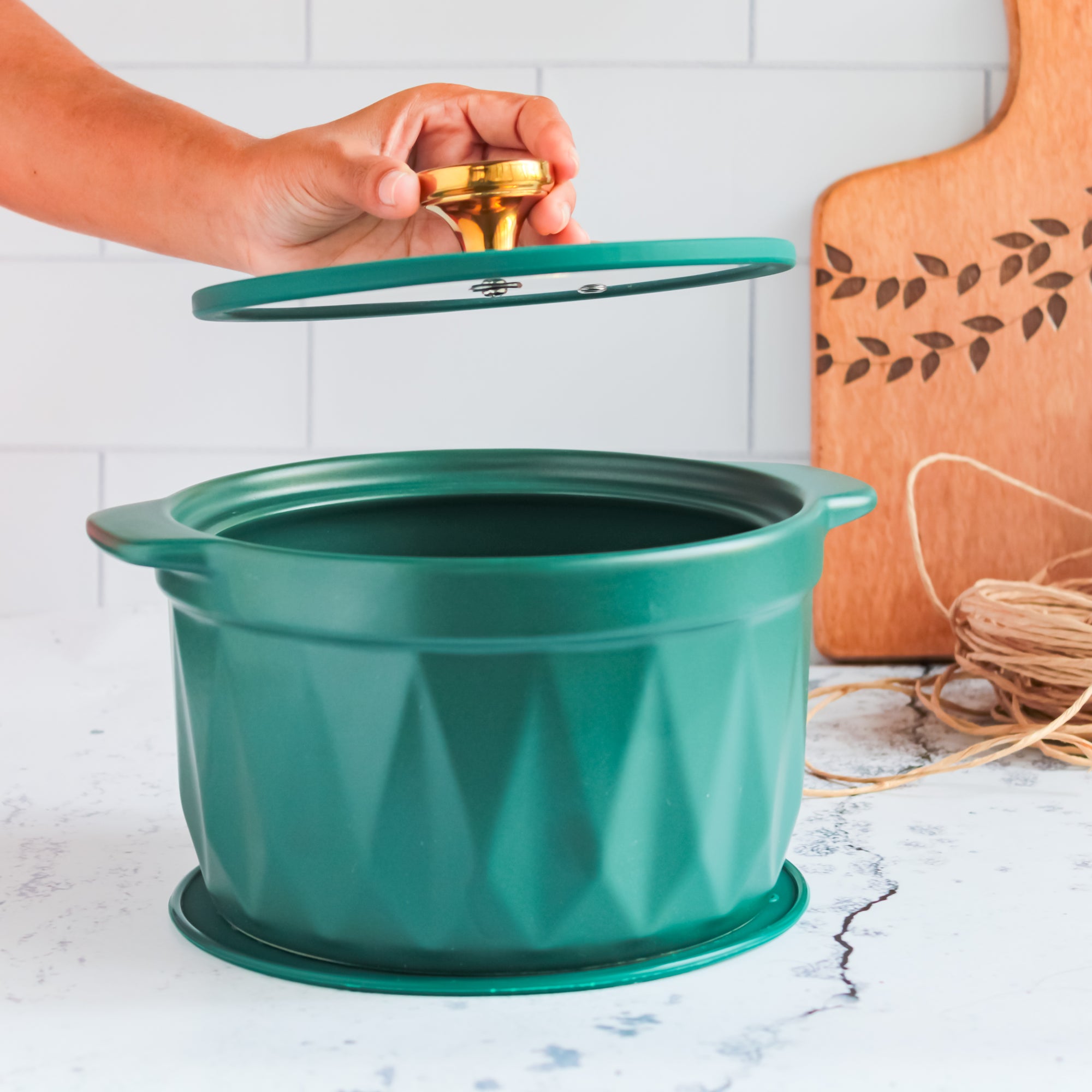 Cooking pot in green that comes with a rubber mat and has two handles along with a glass lid. The cooking pot set is great for cooking, baking as well as serving. Make lentils or meat with gravy, one pot recipes, rice, noodles or any dish in the deep pot. Keep the food warm while serving with the help of the lid and protect the table with the trivet coaster. One can also easily pick, hold and place the cooking pot with the help of the handles on the either sides. The cooking pot can be used on gas flame and in the microwave but it can not be used on the induction.