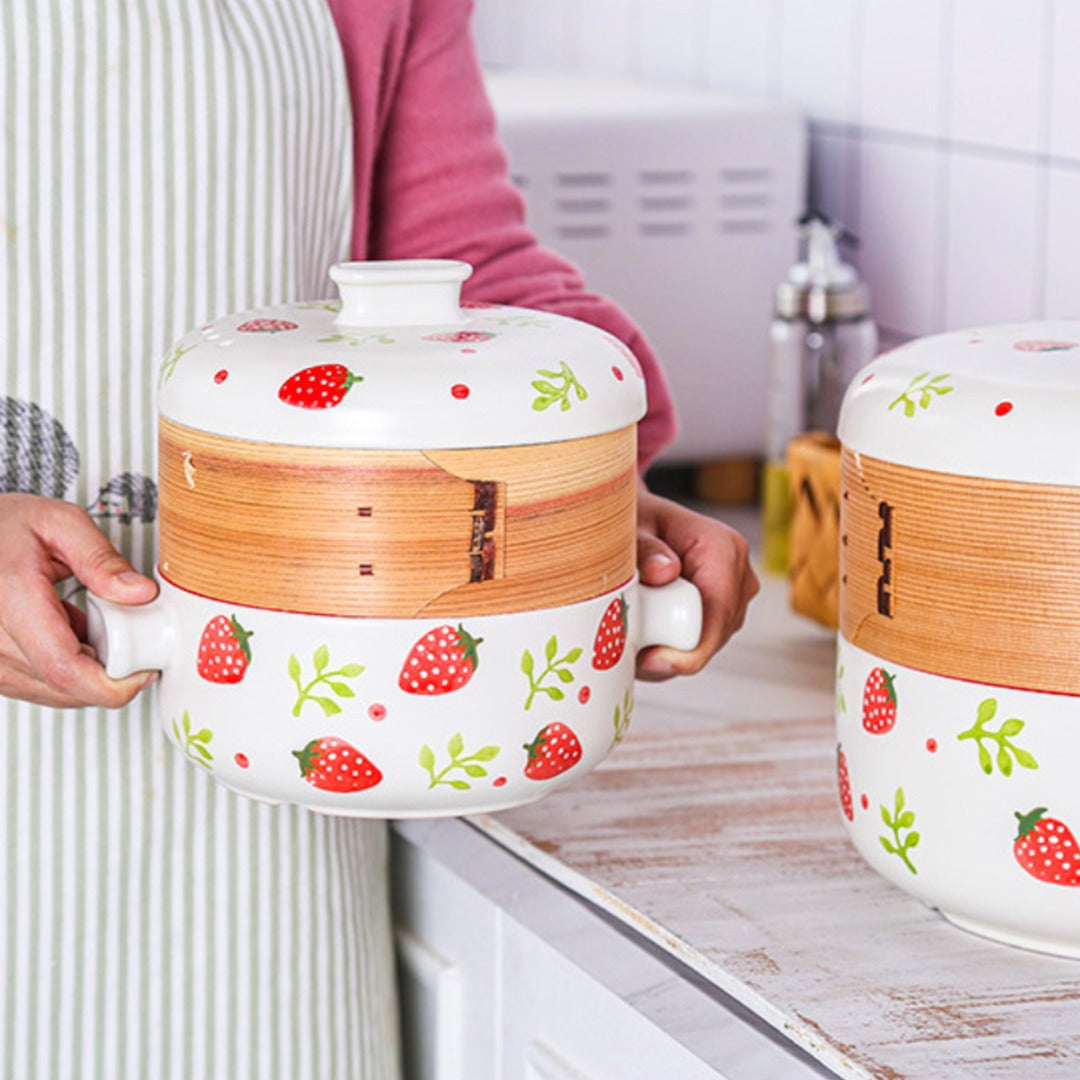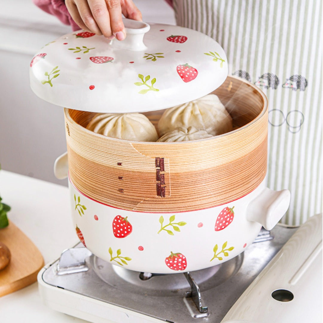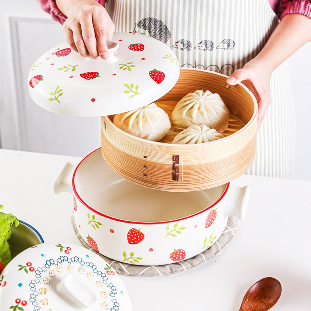Printed ceramic pot for cooking with bamboo steamer in the middle to cook street style dumplings and Momos at home. The Momo pot with a steamer is white in color and comes in 2 print variants, strawberries and cherries. It's now easy to make an entire delicious meal in one pot using the steamer that effortlessly transforms the humblest ingredients into a meal, a hunk of firm tofu with toasted sesame oil and soy sauce, a pile of steamed sliced squash ready to be drizzled with a miso-spiked dressing and even dumplings with some chicken soup at the bottom, that carries the aroma to the dumplings being prepared on the upper part. It can be used directly on the stovetop and the combination of water and heat makes the process quick and requires little to no oil, making for a healthy serving. The steamer pots for Momos are detachable and can be used separately for cooking or serving.