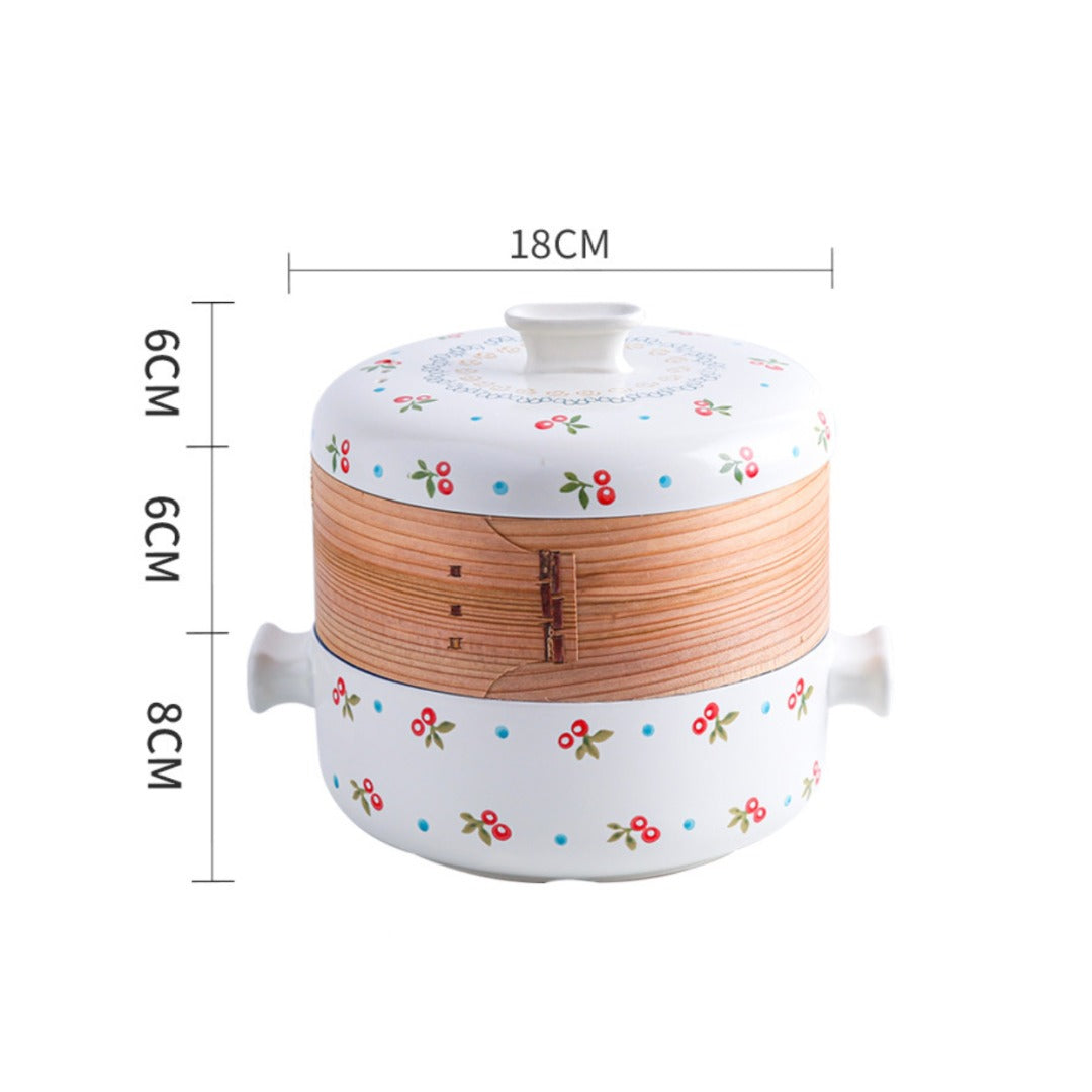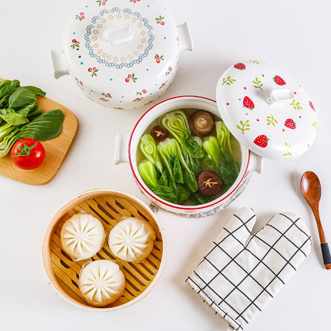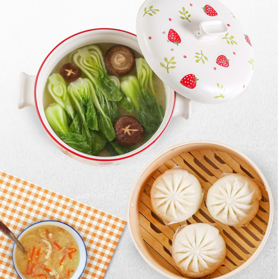 Printed ceramic pot for cooking with bamboo steamer in the middle to cook street style dumplings and Momos at home. The Momo pot with a steamer is white in color and comes in 2 print variants, strawberries and cherries. It's now easy to make an entire delicious meal in one pot using the steamer that effortlessly transforms the humblest ingredients into a meal, a hunk of firm tofu with toasted sesame oil and soy sauce, a pile of steamed sliced squash ready to be drizzled with a miso-spiked dressing and even dumplings with some chicken soup at the bottom, that carries the aroma to the dumplings being prepared on the upper part. It can be used directly on the stovetop and the combination of water and heat makes the process quick and requires little to no oil, making for a healthy serving. The steamer pots for Momos are detachable and can be used separately for cooking or serving.