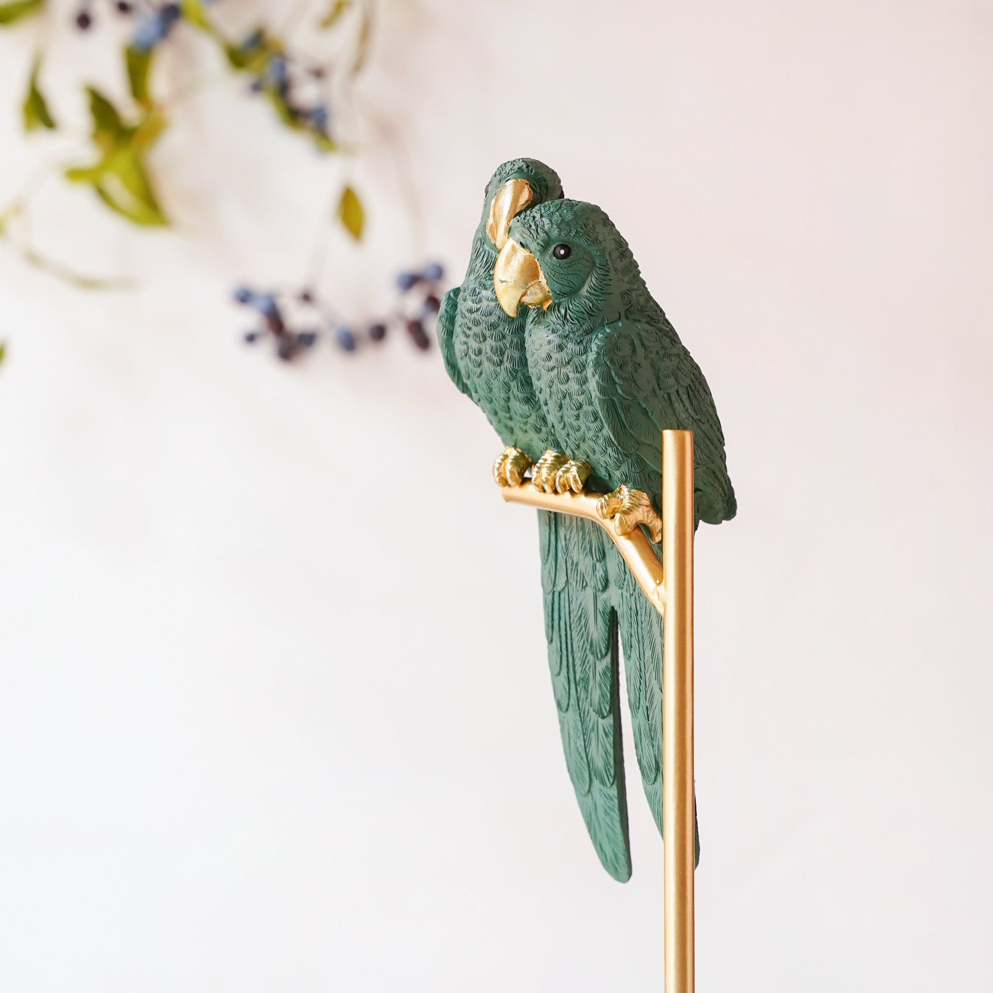 Two green parrots sit together on a lustrous golden stand and exude a tropical vibe. The bird figurine can sit pretty on any tabletop as a centerpiece which will spread positivity in a house or workspace. The colour of the set can give an elegant touch to the place it is being placed in.