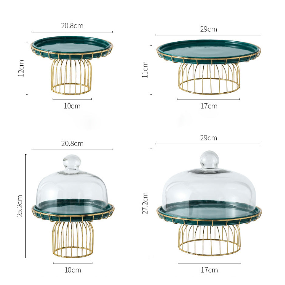 Cake stands with lids can give every luncheon or banquet table setting a metallic beauteousness. The cake stand is fashioned from a gold wrought iron framework, a detachable green ceramic plate, and a glass cloche. The ceramic plates that are removable can each be used as a platter or snack plate to serve confectionery or small refreshments. Additionally, one can use the cloche to cover food without the platter.