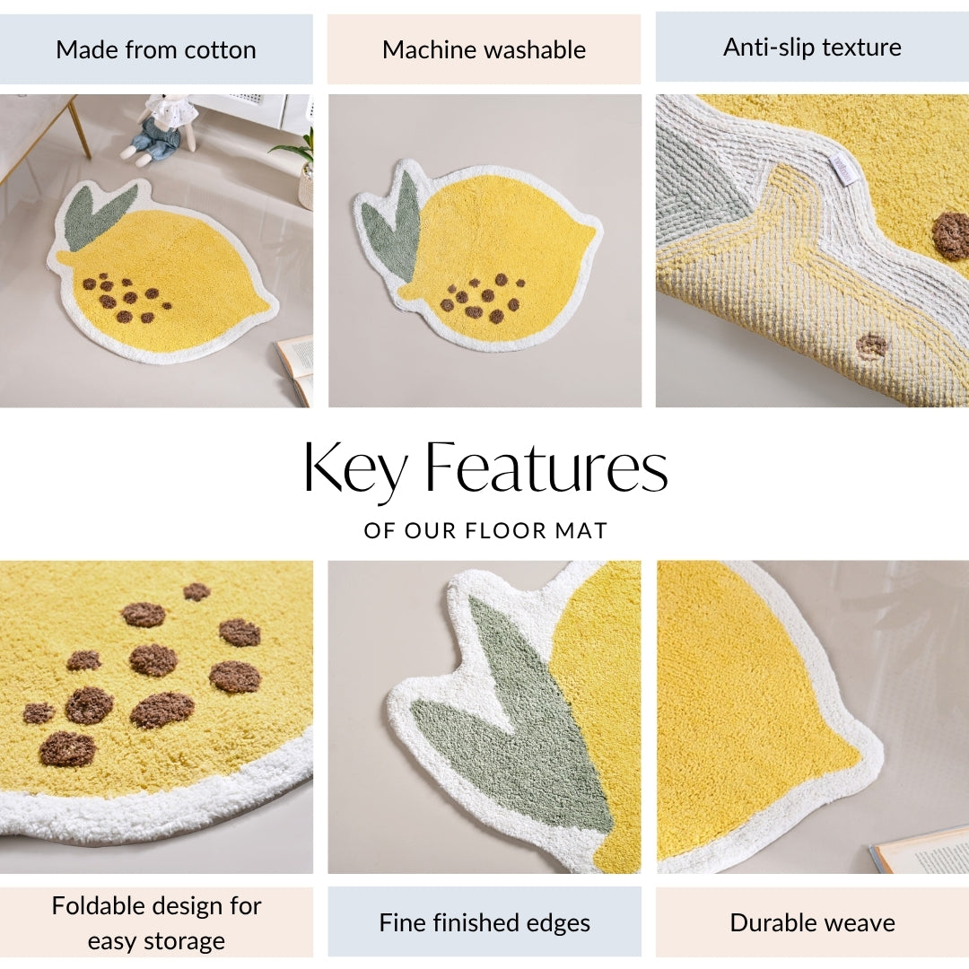 Design: Brighten your home with this plush lemon floor mat that combines cheerfulness and comfort. Its lemon shape and vibrant yellow body, accented with green leaves and brown seeds, bring a fresh, organic look to your living spaces. Whether placed beside your bed, in the bathroom, or by the kitchen sink, this citrusy mat adds a fun, fresh vibe to your décor. Lightweight, quick-drying, and crafted with care, it's a delightful upgrade from basic mats.