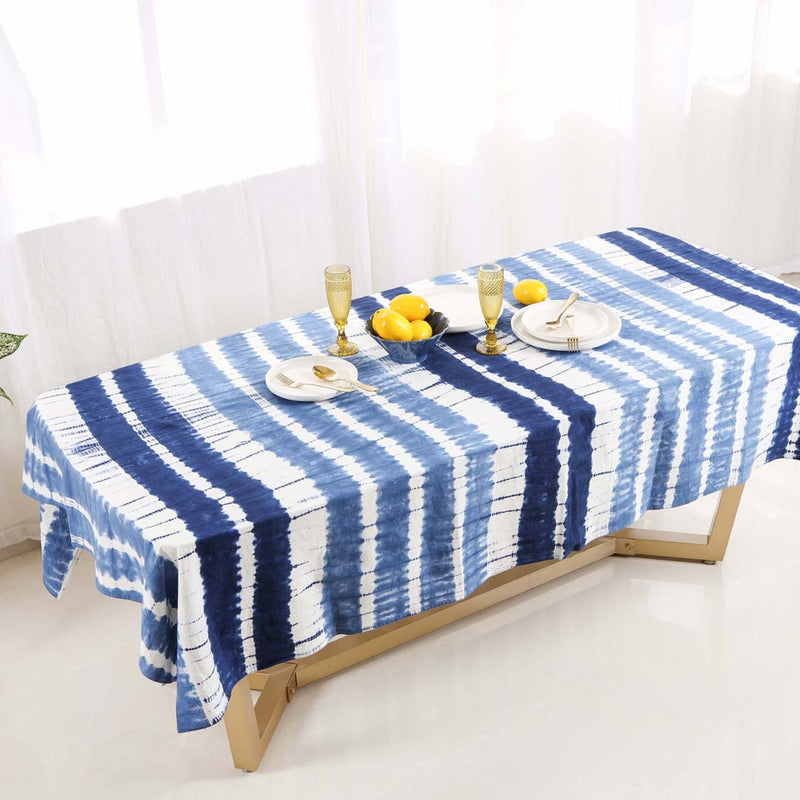However, calming effects the white ignites to the color indigo. The blue tie and dye cotton table cloth makes the dining or coffee table look friendly and inviting. The design is for modern dining and household needs. The table cloth is available in a trendy color contrast that will surely grab the attention at a dinner party. The table cloth is used to protect the table from heat, scratches, and stains. The table cloth may be used alone on the dining table or the coffee table, or it can be combined with matching tea towels. The table cloth can also be used on bedside table or at a work desk to give it a visual appeal or to organize any space.