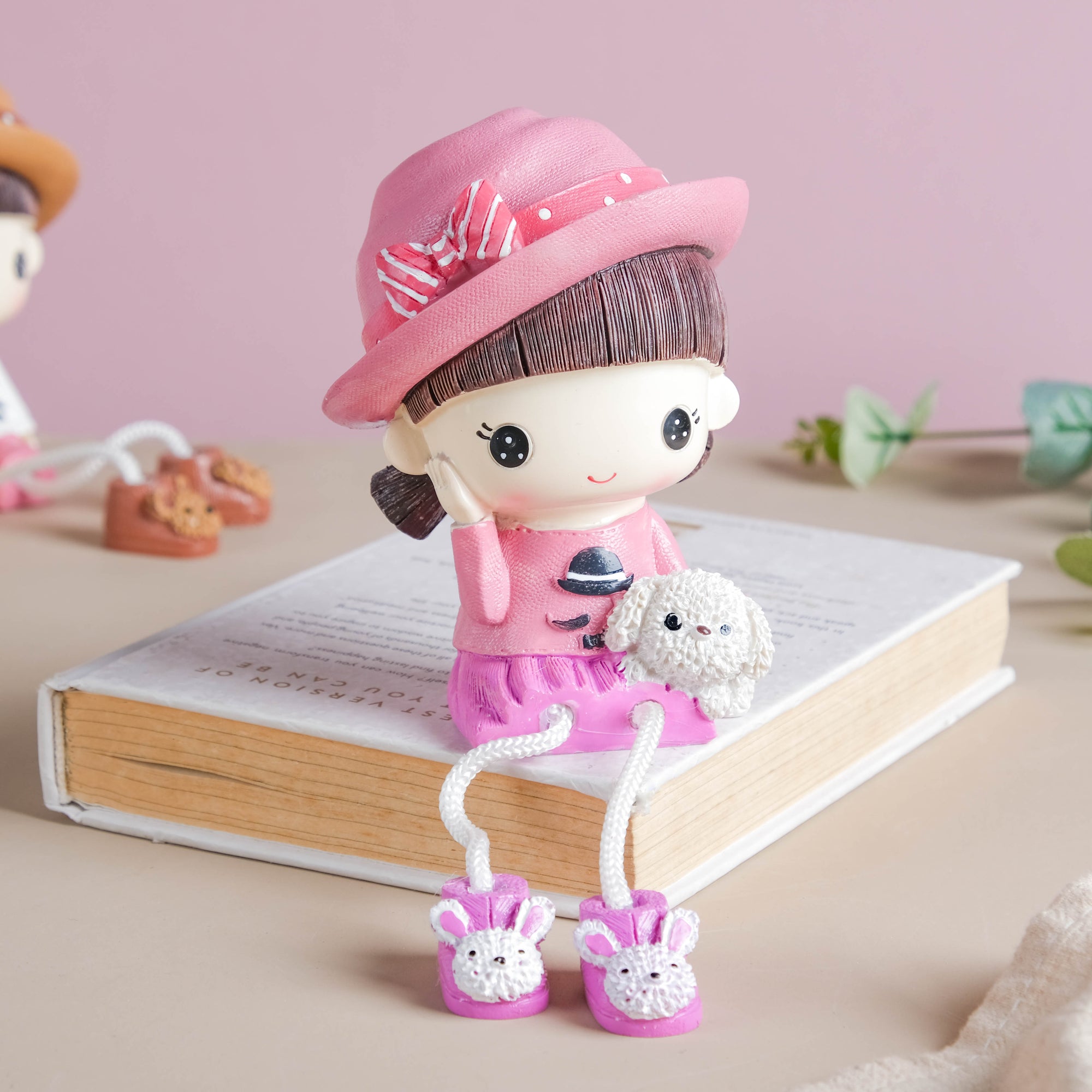 The funky and playful little figurine sits with an adorable teddy which makes it a charming addition to one's showpiece collection. The pair of teddy shoes adorn the string legs and the slanted hat with a bow brings back the nostalgia of childhood days. Place the resin showpiece in a corner shelf or on the television cabinet to uplift the décor set-up.