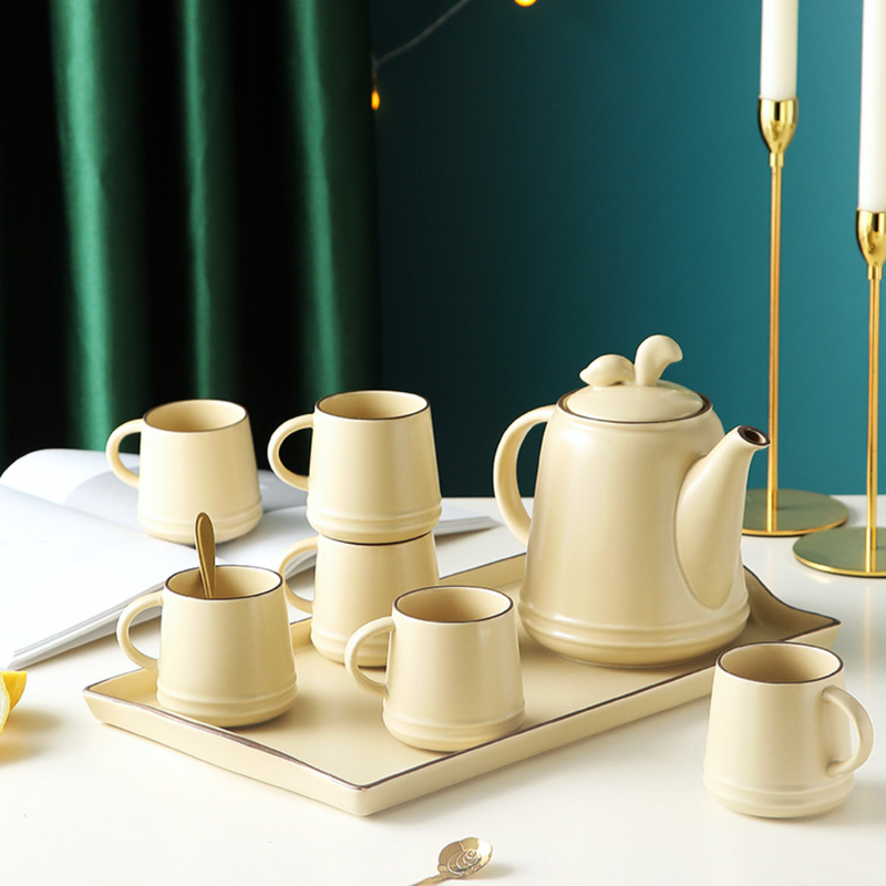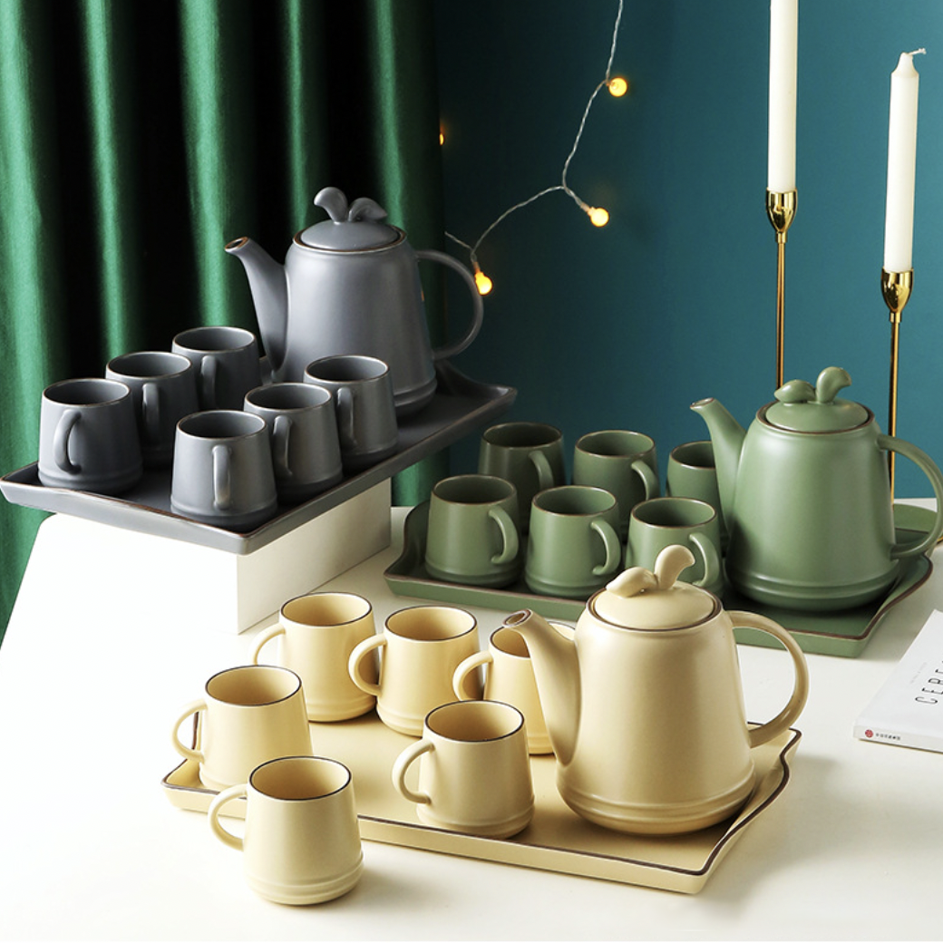 The teapot comes with a spout, detachable lid, and a C-shaped handle, while the mug is cylindrical and has a perfect round handle attached to the side. A rectangular tray also accompanies the set and has two raised edges acting as handles for one to carry around the tray with ease.