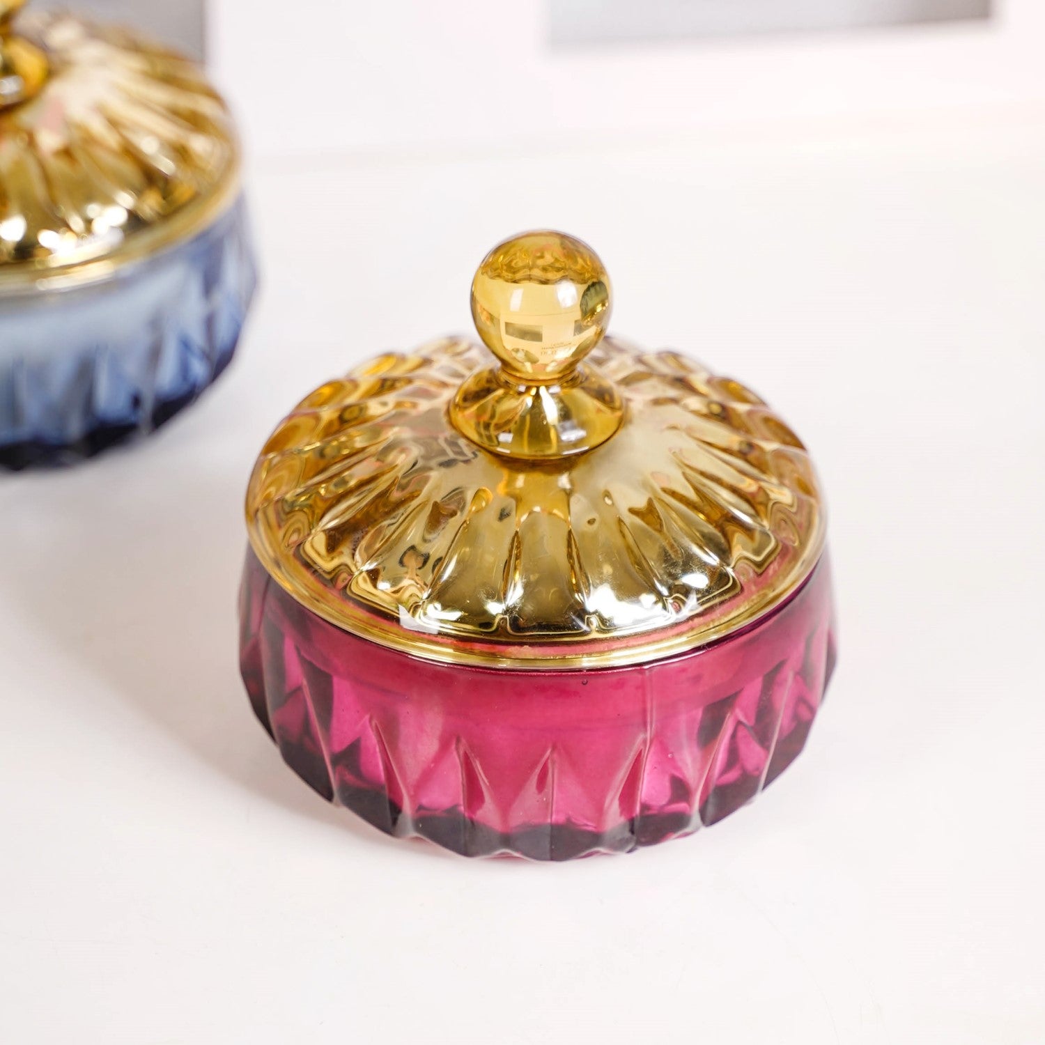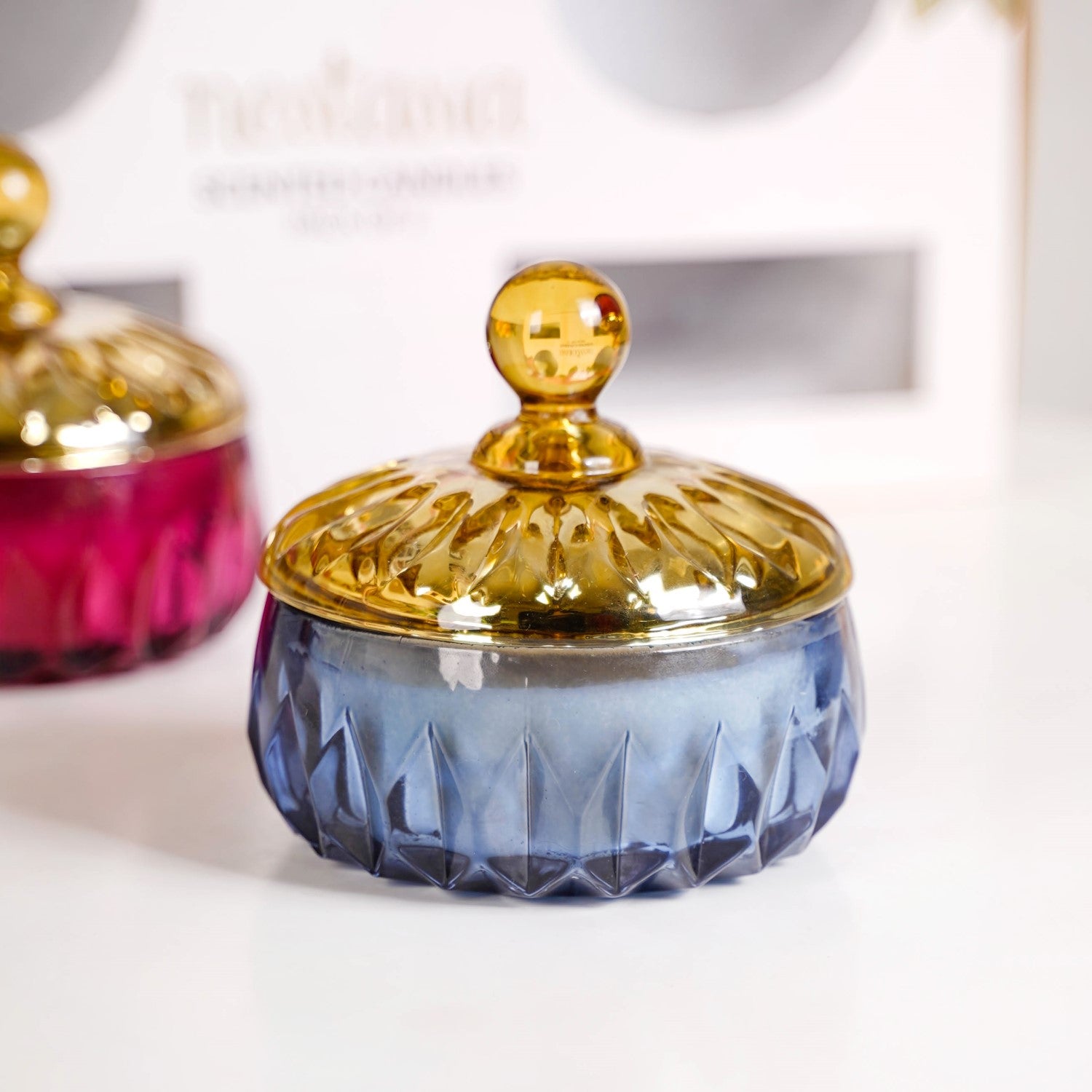 Design: Encased in striking glass jars with an intricate geometric embossed pattern, these candles offer more than just a delightful fragrance—they double as decor. The soft blue and rich purple hues of the jars evoke a sense of calm and sophistication, while the amber-toned lids add warmth and contrast, creating a subtle yet luxurious look. Whether styled together or individually, these candles add a polished, decorative flair to any room.