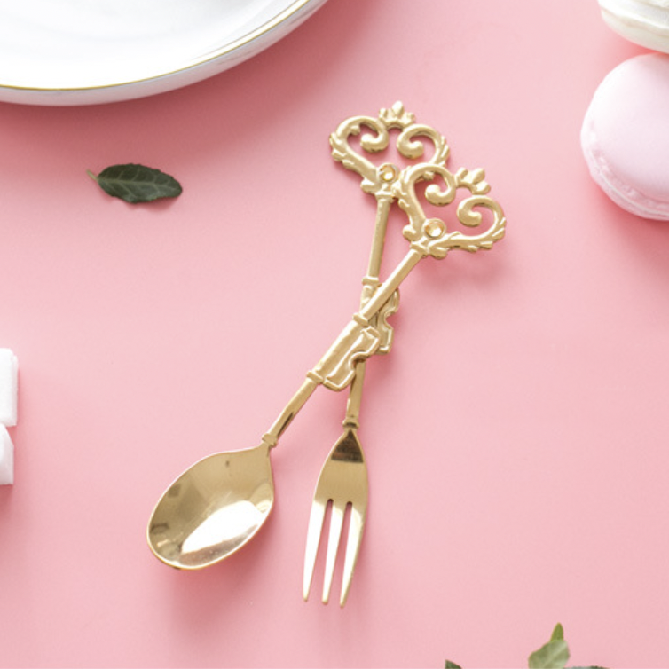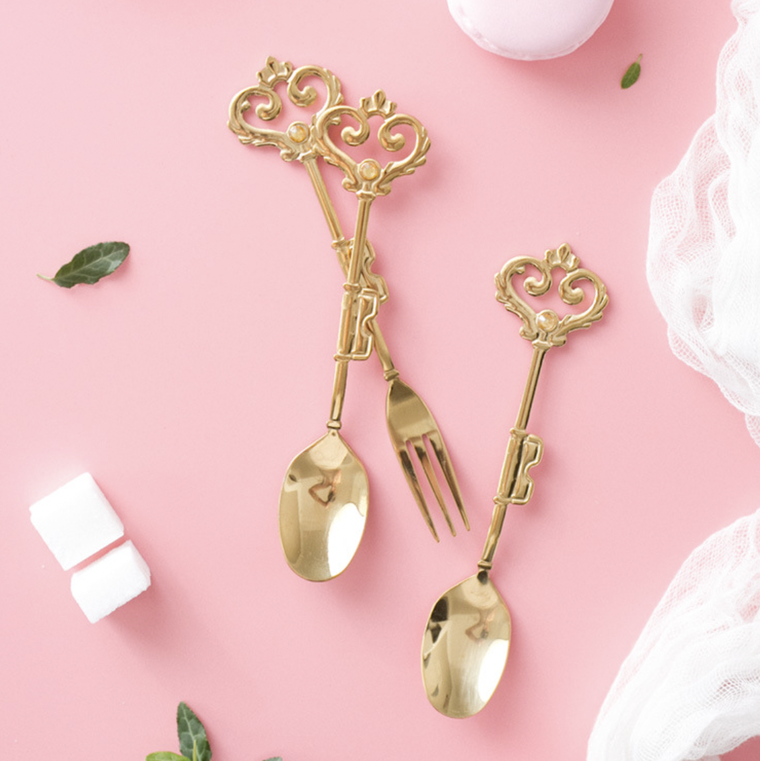 The golden cutlery set is a great aristocratic addition to the dinner table. The intricate crown design at the top of the spoon and fork looks spectacular when complemented with solid or textured ceramic plates and bowls.