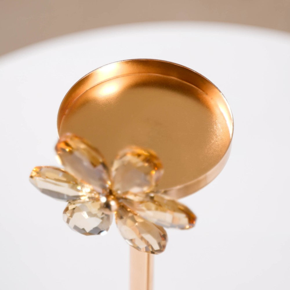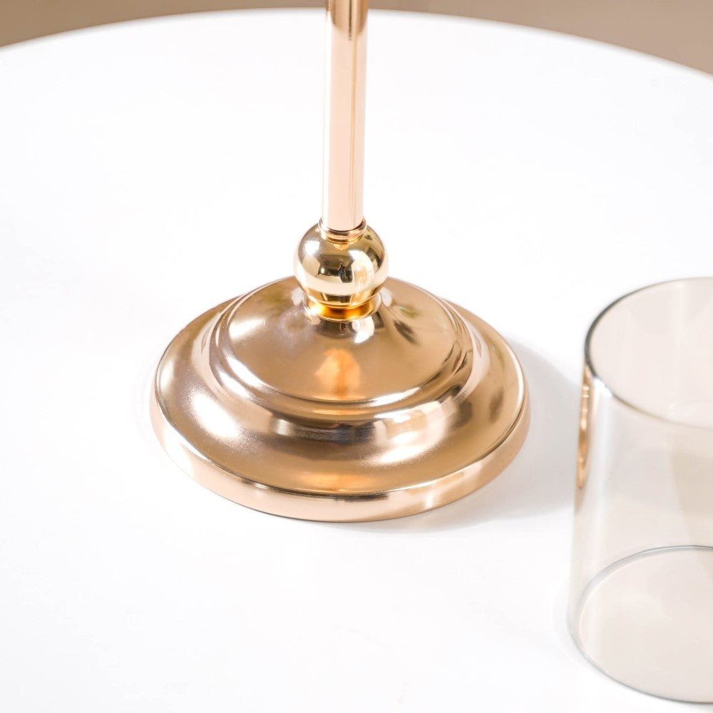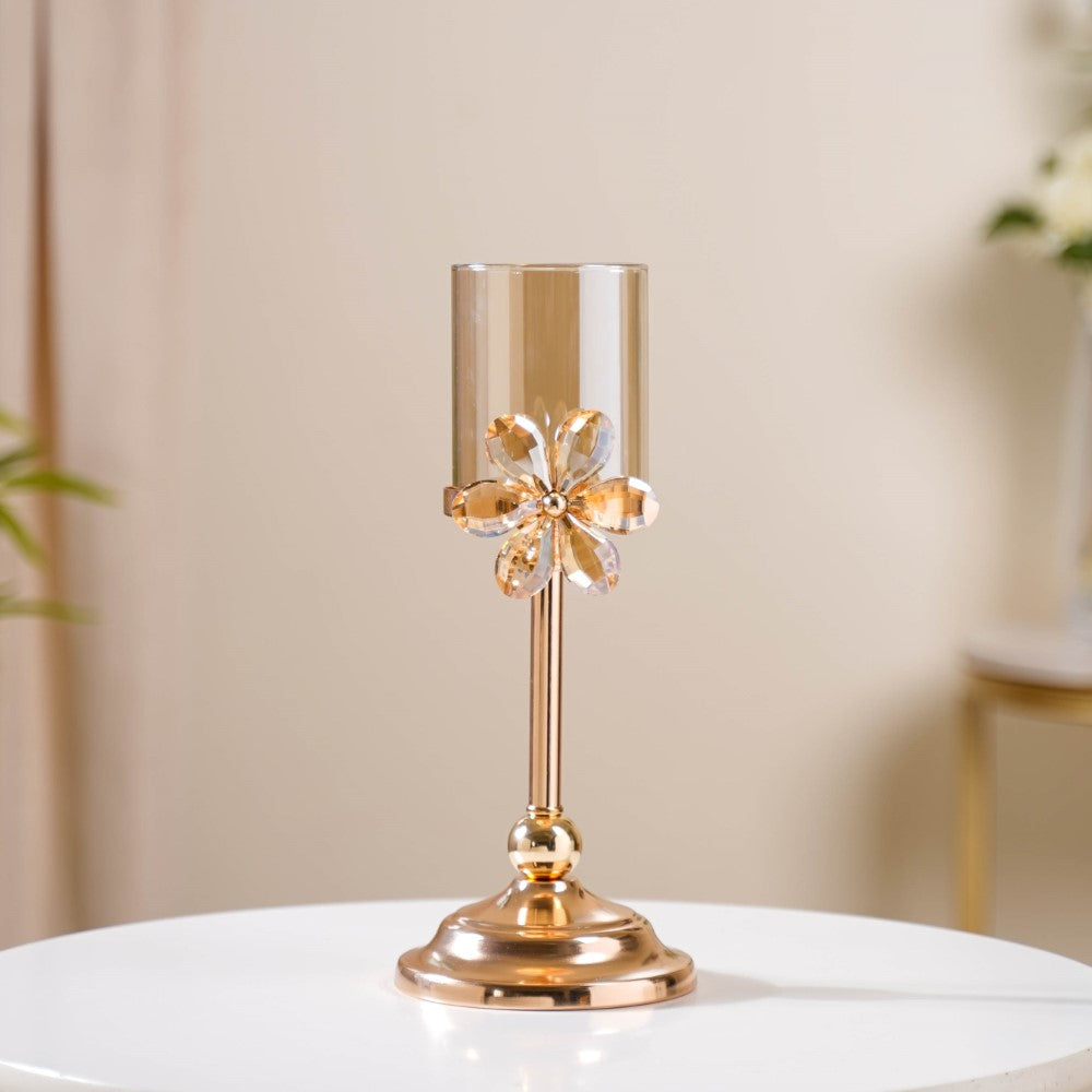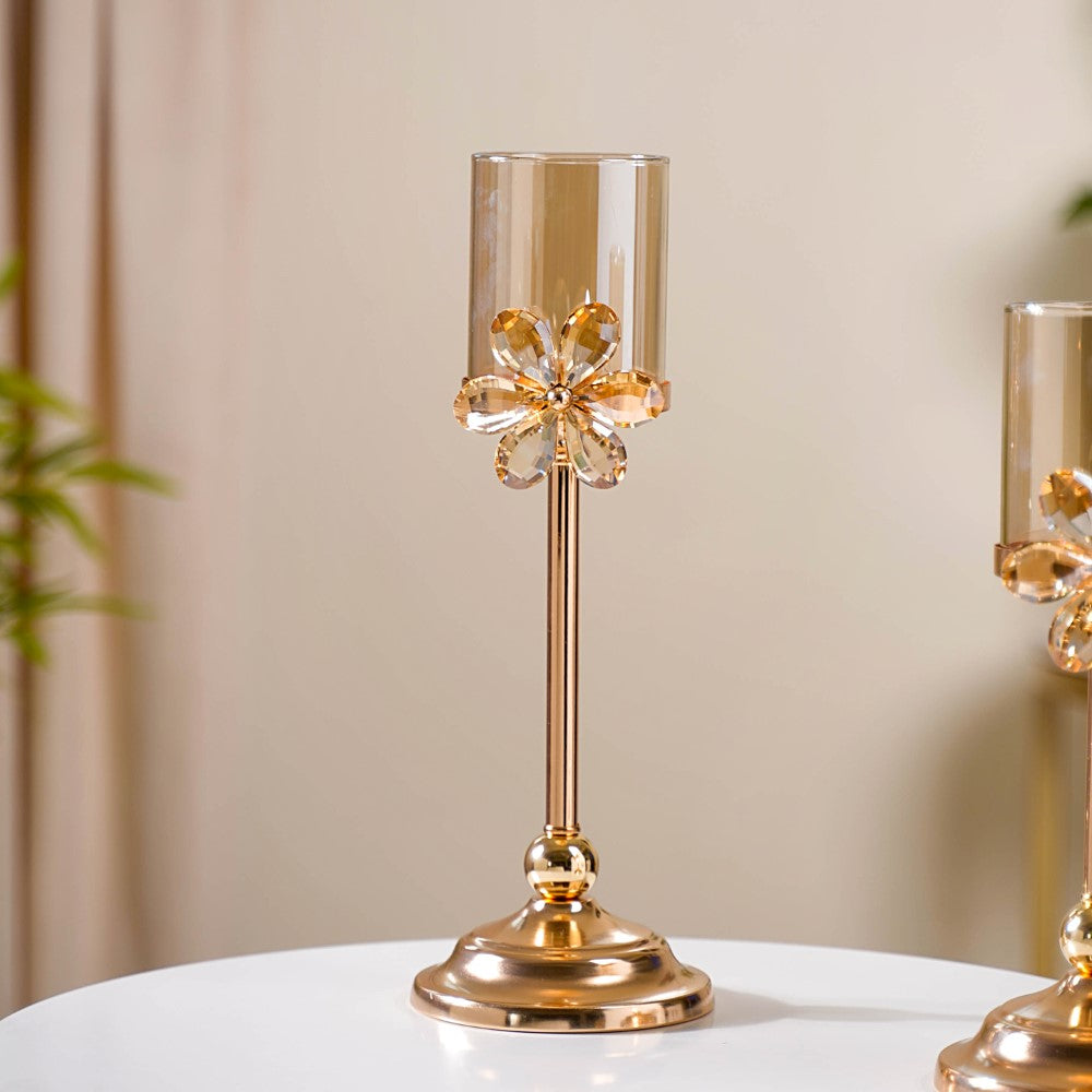 The metal and glass candle stand set features 2 hurricane-style candle stands of different sizes, exuding a luxurious aura. The gold-tinted glass top of the candle holder set can add sparkle to a beautiful candlelit evening. Not to mention, the high-sheen gold metal exterior and the crystal design make the candle stands shimmer in the candlelight. The fusion of metal and glass in the candle stand set creates a fantastic aesthetic appeal while maintaining superb form and functionality. Pair the candle stands together for a stunning visual effect and watch them shine brightly even without any candlelight.