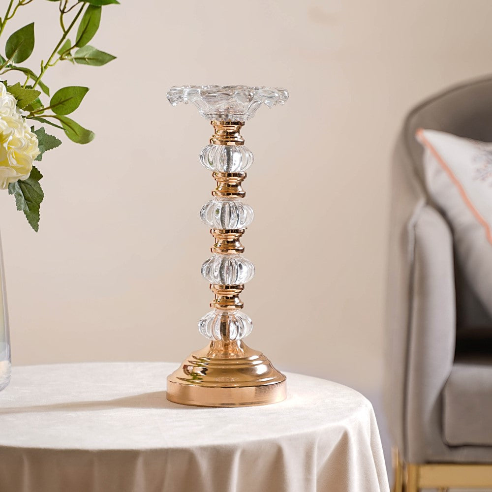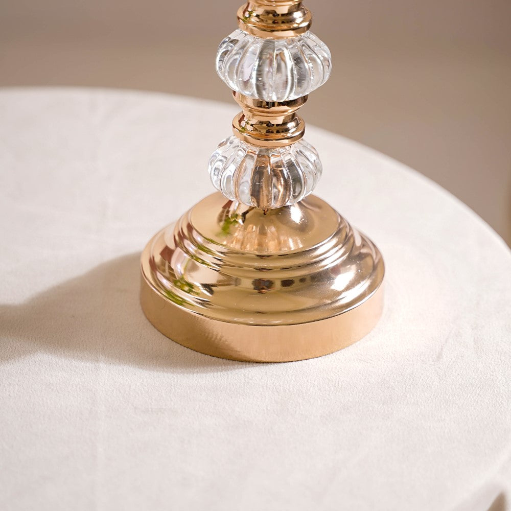 The shimmering grandeur and luxurious appeal of the candle holder set, which features 2 candle holders of different sizes, can help you create the ultimate luxe vibe in your room decor. The intricately crafted crystal glass elements of the candle stands pair beautifully with their lustrous golden metal components, creating a gorgeous and luxurious affair. The high-sheen metal and crystal finish of the candle holders reflect candlelight to create a stunning visual effect and make your evenings at home sparkle with lavishness. Use the candle stands as table centrepieces to set a romantic vibe for your candlelight dinner date.