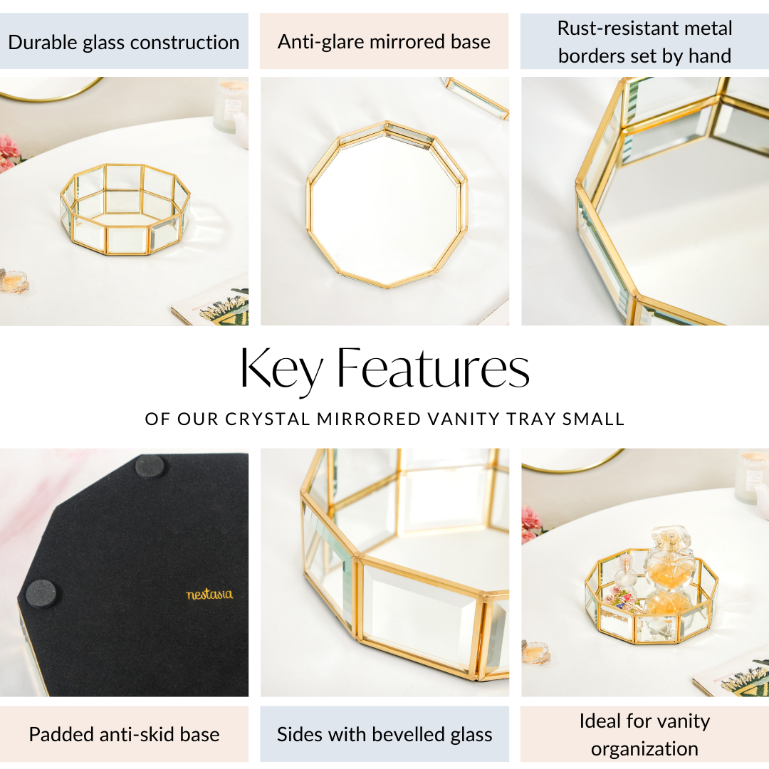 Design: The epitome of modern sophistication, this trinket tray is skillfully crafted from high-quality tempered glass with golden-hued rust-resistant metal borders that are set by hand. Featuring intriguing bevelled glass on all sides and an anti-glare mirrored base for crystal-clear reflections, this luxurious tray is a must-have for every modern home. Equipped with a protective anti-skid base to reduce accidents and possible damage, this stunning trinket tray seamlessly combines form and function.