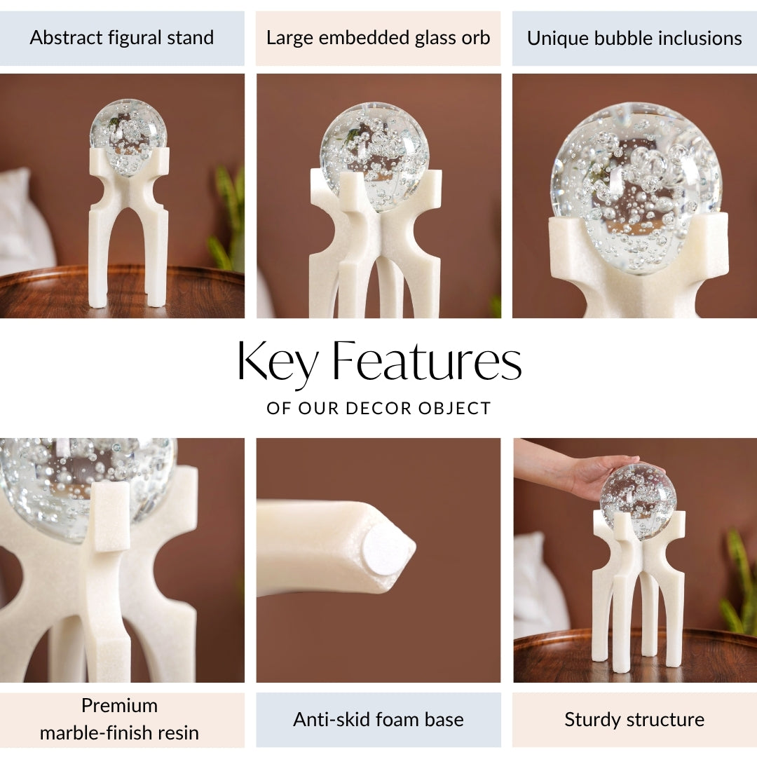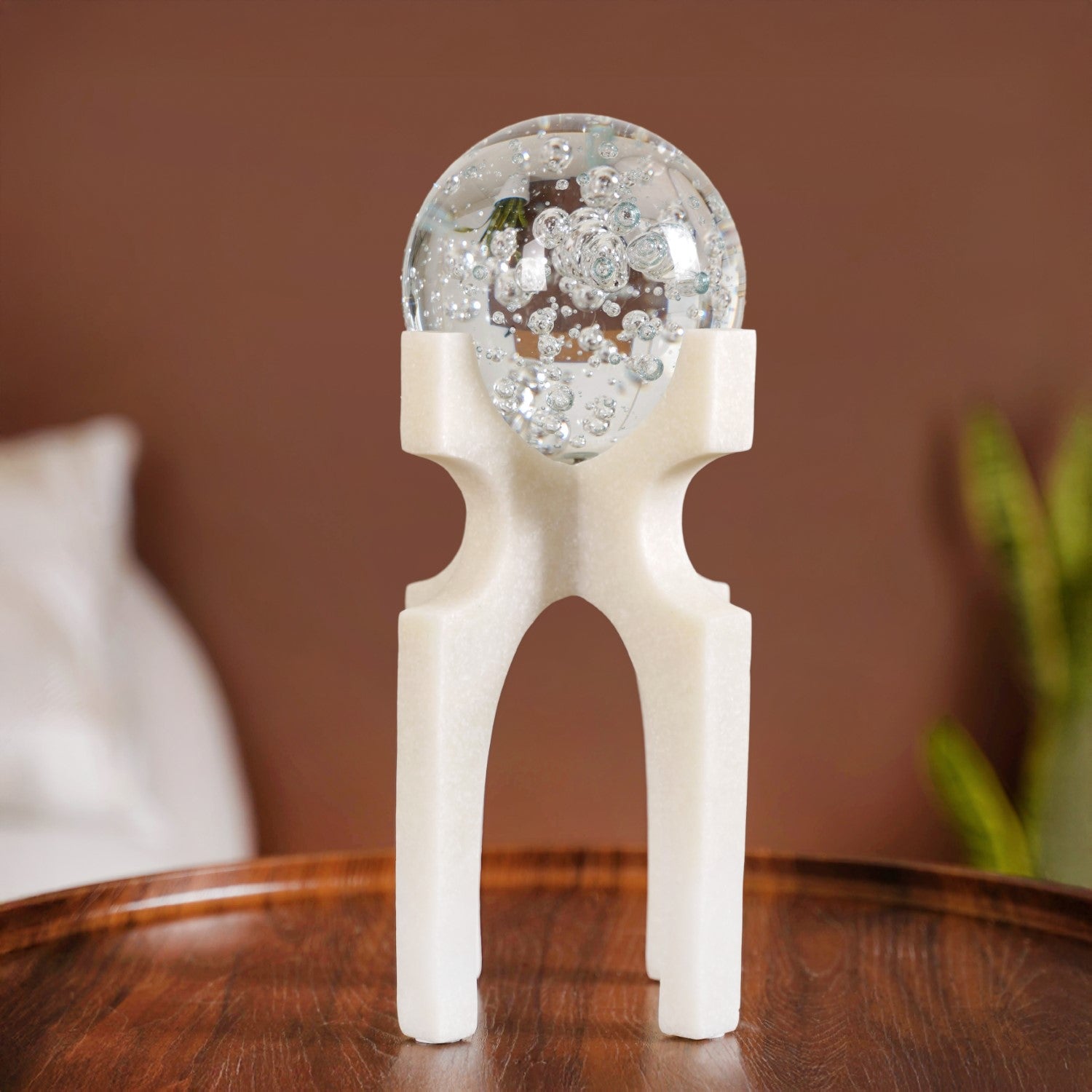 Design: This piece is anchored by its striking abstract figural stand, skilfully sculpted with a flowing, minimalist form. It features a pristine white monochromatic smooth finish that highlights its clean lines. The stand securely cradles a dazzling embedded glass orb, which holds shimmering, unique bubble inclusions, giving the appearance of stardust frozen in a perfect sphere of resin art.