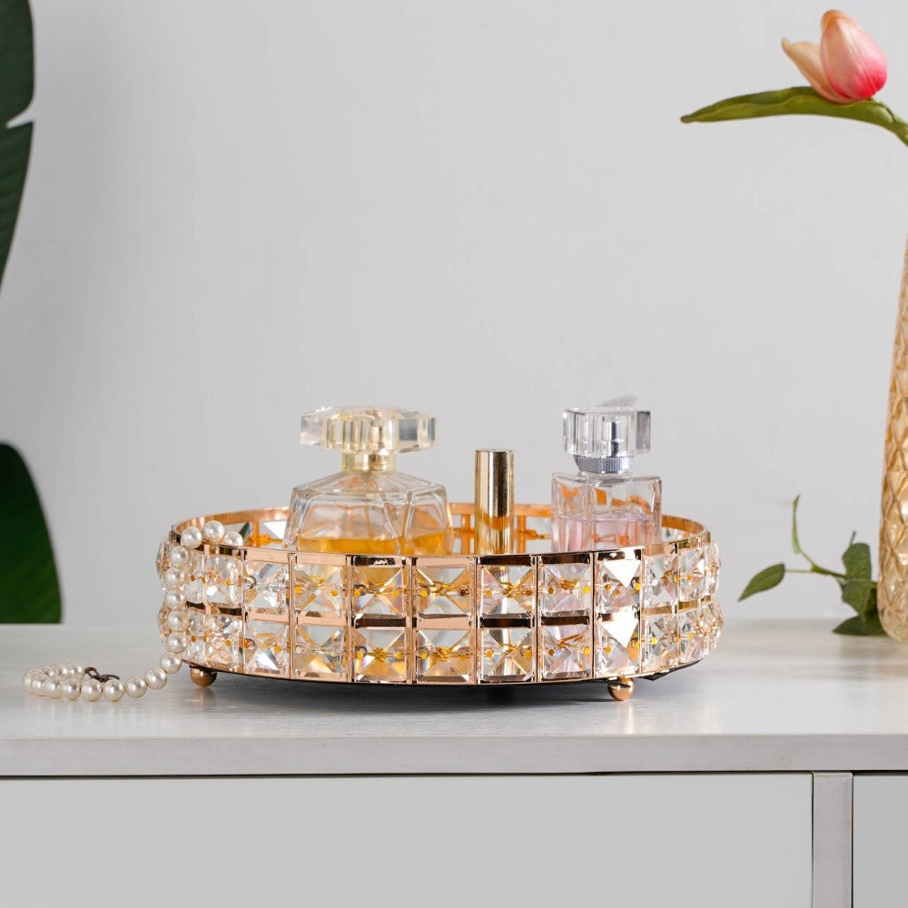 Experience the essence of elegance and opulence with our gorgeous circular mirror tray. This extraordinary tray embodies luxury and sophistication, bringing a touch of glamour to your home decor. Its golden metal border design, meticulously crafted, radiates richness and splendour. Embellished with sparkling crystal beads, it adds a dash of allure to any room. This mirror tray is not only practical but also visually captivating, making it a striking centrepiece for showcasing your treasured possessions or serving your preferred beverages and snacks in a stylish manner. Elevate the ambience of your living space with this remarkable circular mirror tray, a true testament to impeccable refinement.