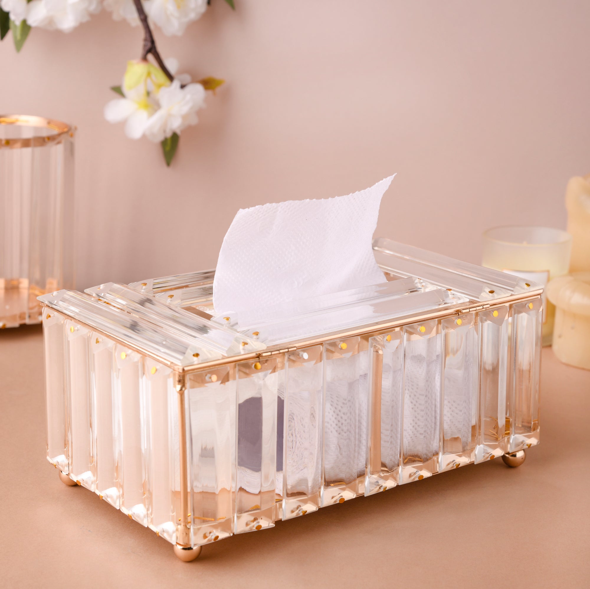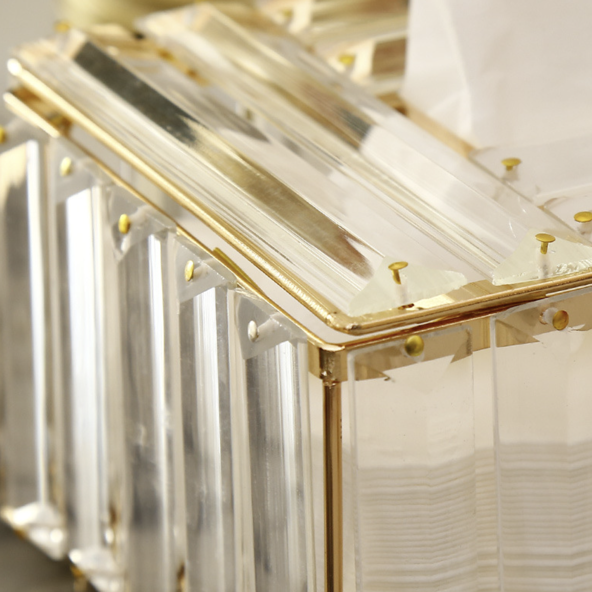 The gold tissue box in a classic transparent look is the perfect way to elevate a simple daily use item like tissues. The tissue box has a golden rim that makes it a décor object while also being a practical item. The classic tissue box can be used as a tissue holder for the car, on the dining or side table, or even in the bathroom. The classic look of the tissue paper holder can blend in with any setting and organize it at the same time.