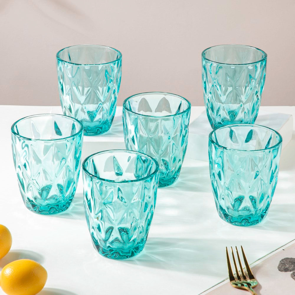 Since the water tumbler set comes in an elegant teal colour, you can pair it with a textured glass jug. You can also add white crockeries and dinner sets to go with the glassware set to create a stunning table decor that'll woo your guests.