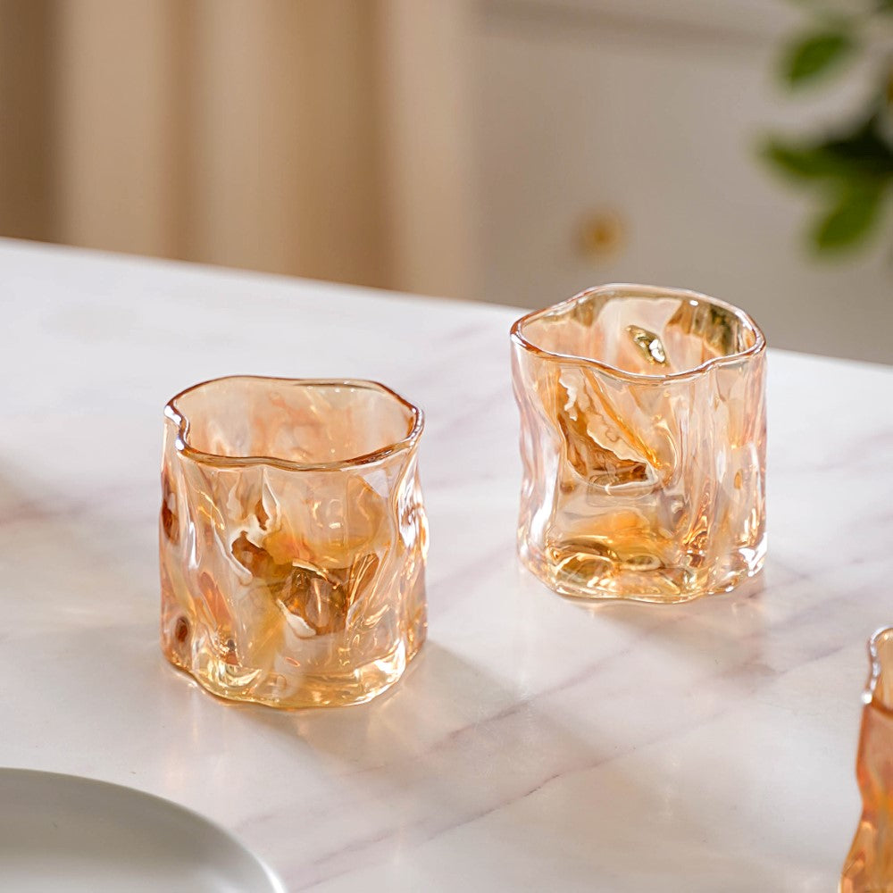 Our exquisite set of six whiskey glasses is perfect for connoisseurs and enthusiasts alike. Crafted with impeccable attention to detail, each glass showcases a stylish textured exterior, adding a touch of sophistication to your sipping experience. The rich amber colour enhances the visual appeal, creating a mesmerizing display on any bar or tabletop. These glasses are meticulously designed to enhance the aroma and flavour of your favourite spirits, allowing you to fully immerse yourself in the indulgence of fine whiskey. Elevate your drinking rituals with this premium collection, a true testament to the art of whiskey appreciation. Immerse yourself in luxury, and sip in style!