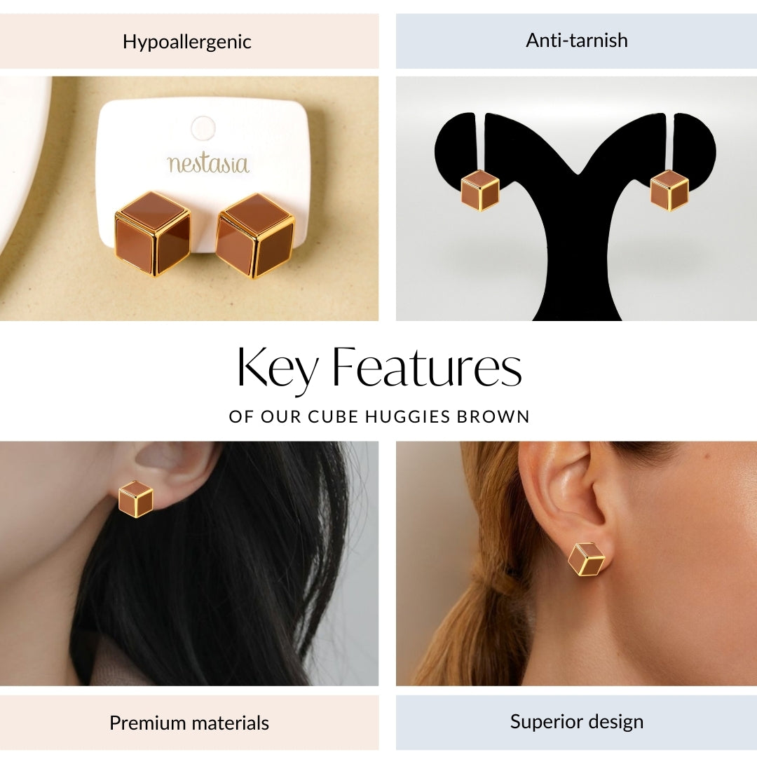 A perfect balance of strength and softness, these huggie earrings combine bold design with refined elegance. Inspired by geometric symmetry and clean, modern lines, the cube shape gently wraps around the lobe for a striking yet sophisticated look. The warm gold frame highlights a deep brown center, creating a harmonious contrast that feels both contemporary and timeless. Versatile and sleek, they effortlessly elevate any outfit with understated luxury.