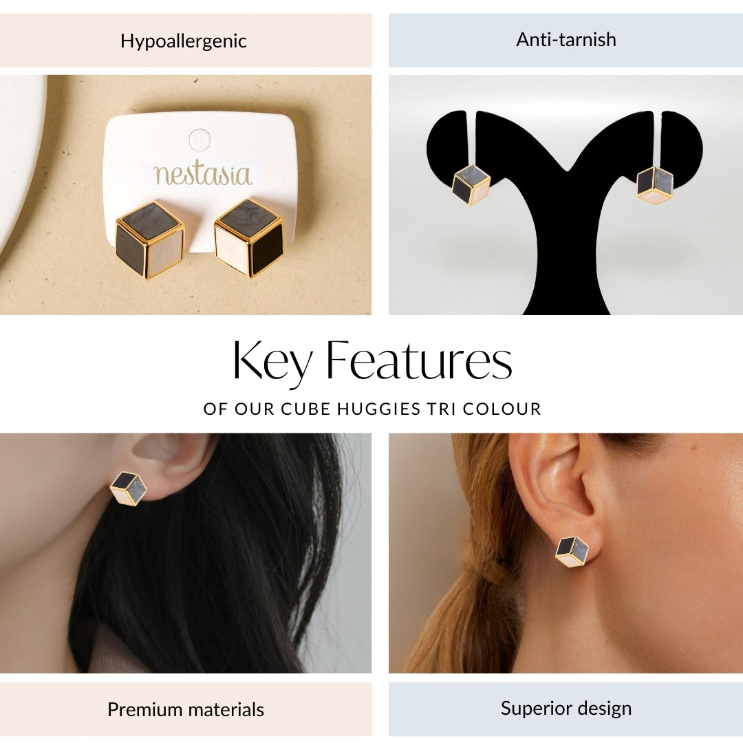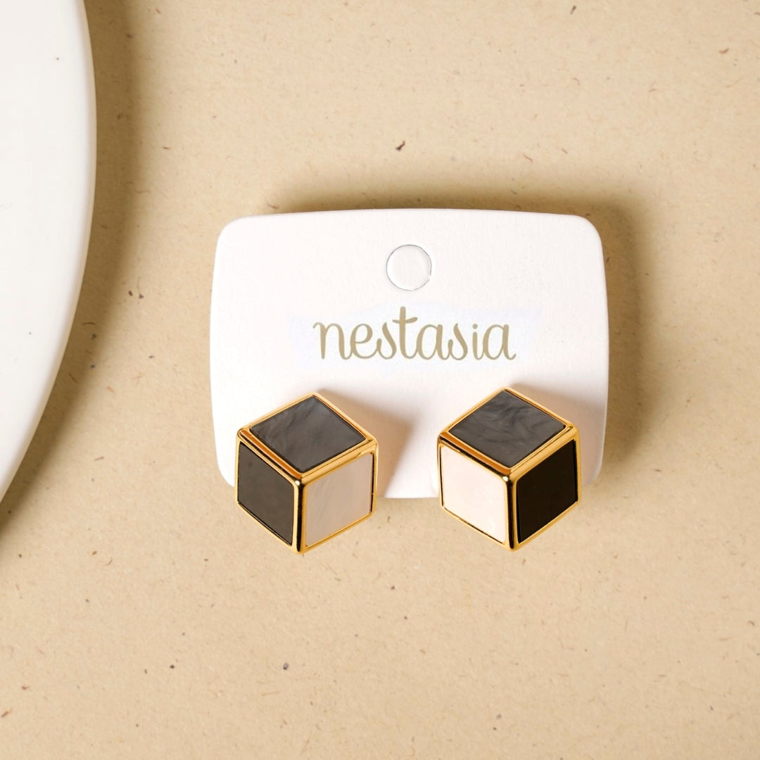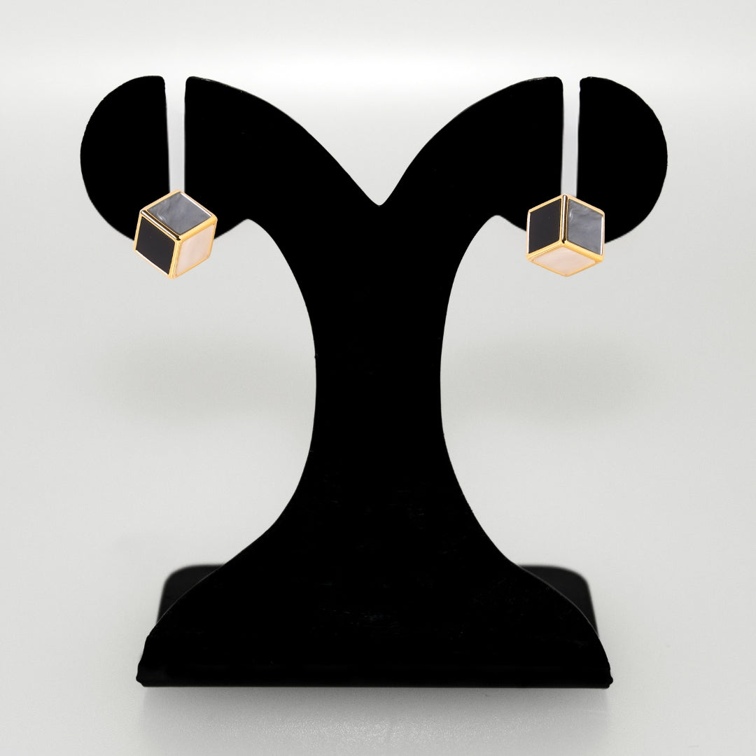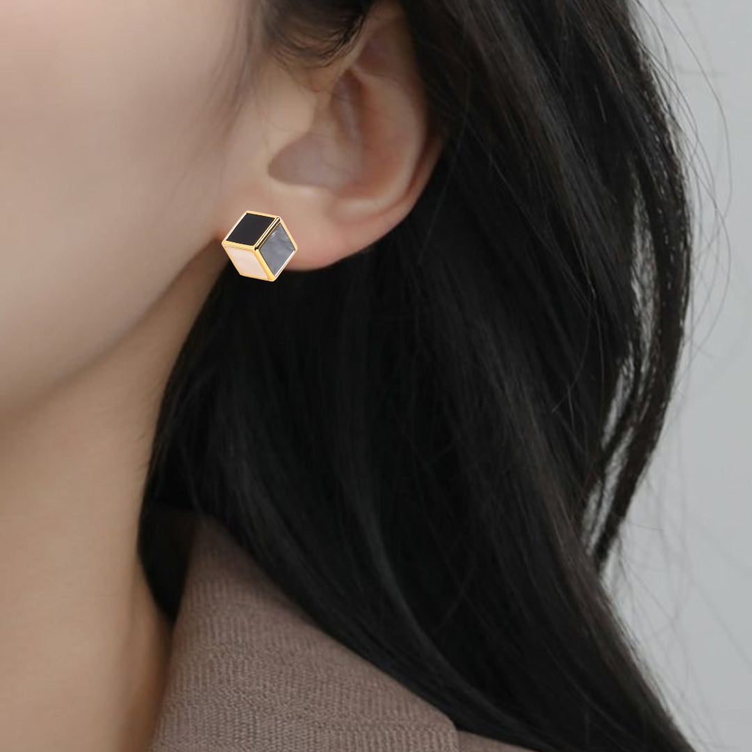 A striking fusion of contrasts, these huggie earrings embody a perfect harmony of bold design and subtle elegance. Inspired by geometric shapes and clean lines, the cube design wraps around the lobe with effortless sophistication. The warm gold frame sets off the center, which showcases a dynamic blend of black, white, and grey sides, creating a visually captivating and balanced effect. Designed to make a statement, they add a contemporary edge to any ensemble while maintaining timeless appeal.