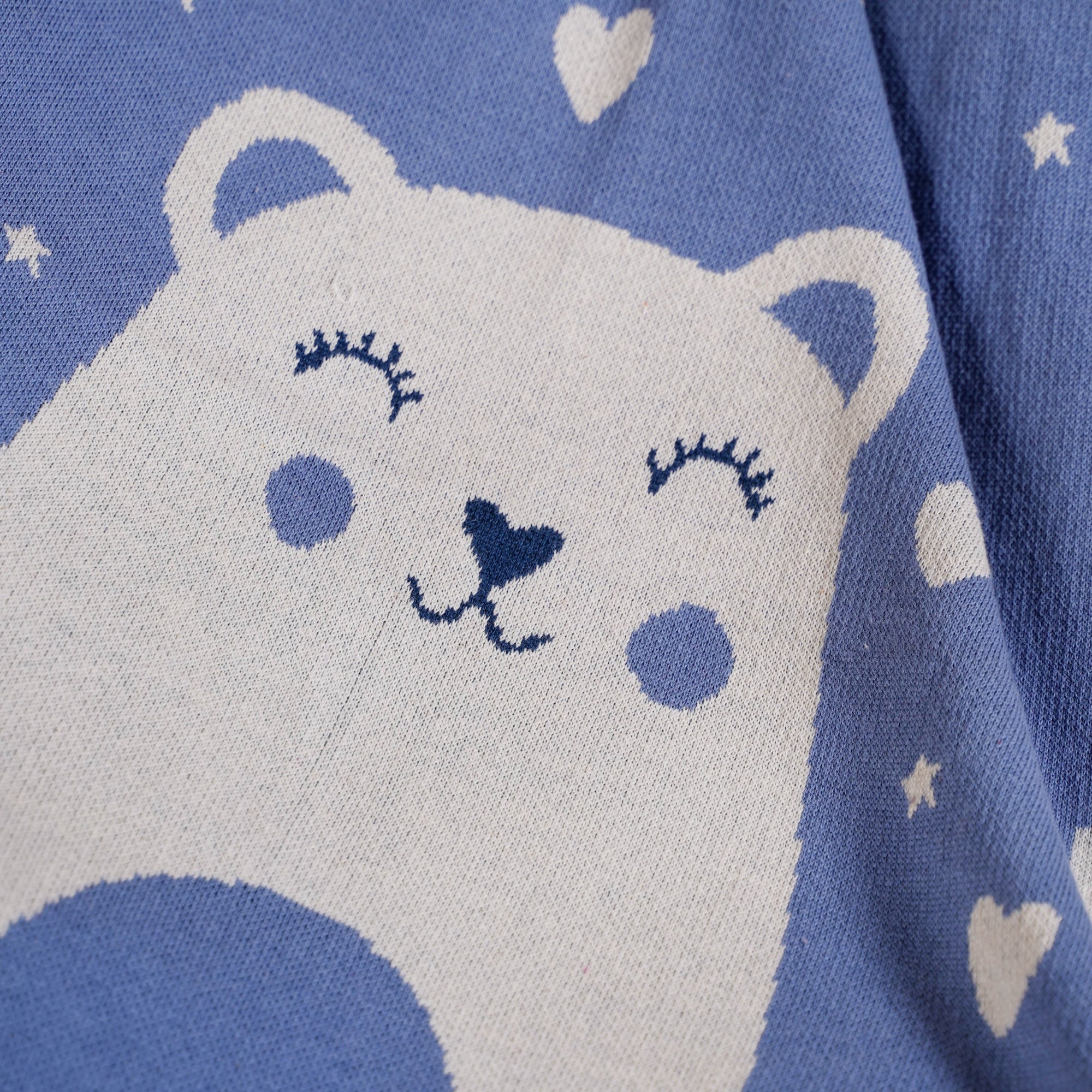 Meet the cuddliest bedtime companion with this 100% cotton kids throw blanket. Designed with a smiling bear and soft blue hues, this breathable and cosy knitted throw makes naps, bedtime, or travel extra comfortable for little ones while adding a sweet, playful charm to any nursery.