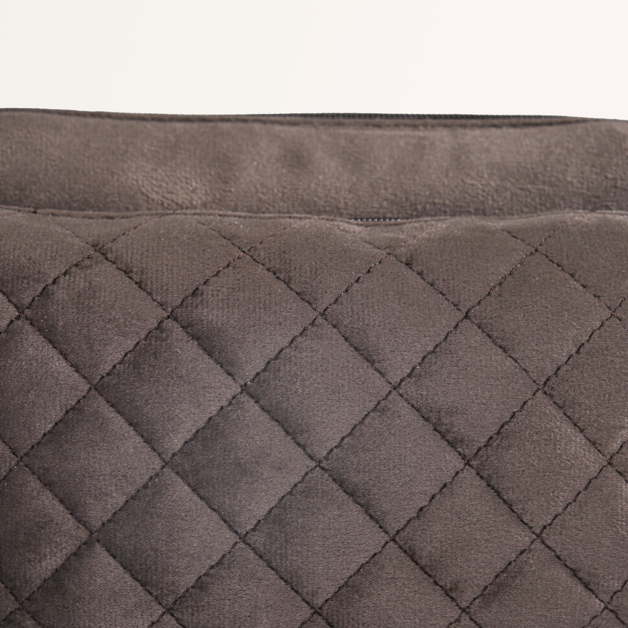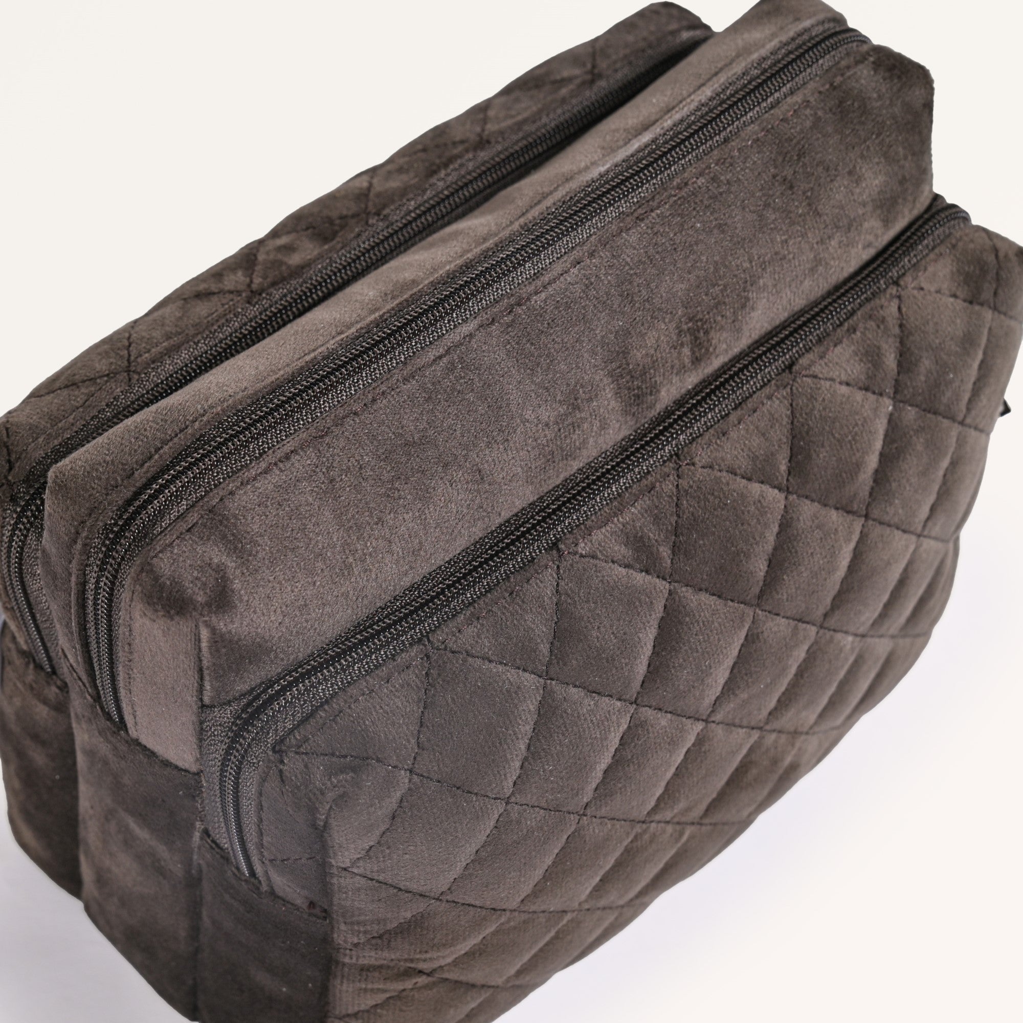 Design: The travel pouch features a soft, 100% premium velvet exterior in a rich dark brown shade, offering a sophisticated look. Its cushiony quilted design adds an extra layer of comfort while protecting your items. The pouch is equipped with one spacious main compartment and two small side compartments for easy organization, all secured with smooth metal zipper enclosures for added durability.