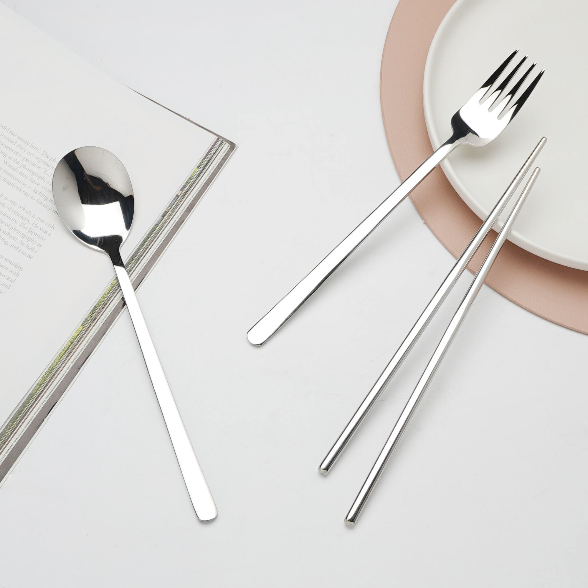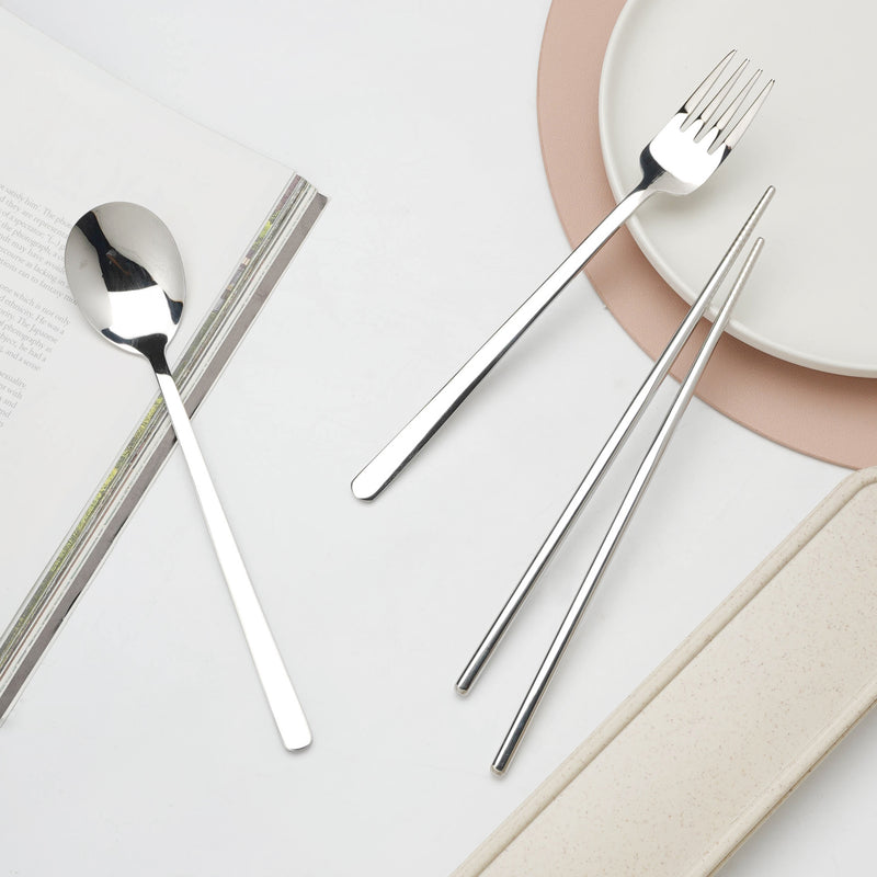The cutlery set in silver hue is accompanied by a cream colored storage box in matte finish. The box has buckles inside it to keep all the cutlery in place. A pair of chopsticks, a fork, and a spoon are all included in the stainless steel cutlery set. The silverware cutlery set can mix well into all sorts of dining settings - from formal to informal. The boxes have buckles inside them to keep all the cutlery in place.