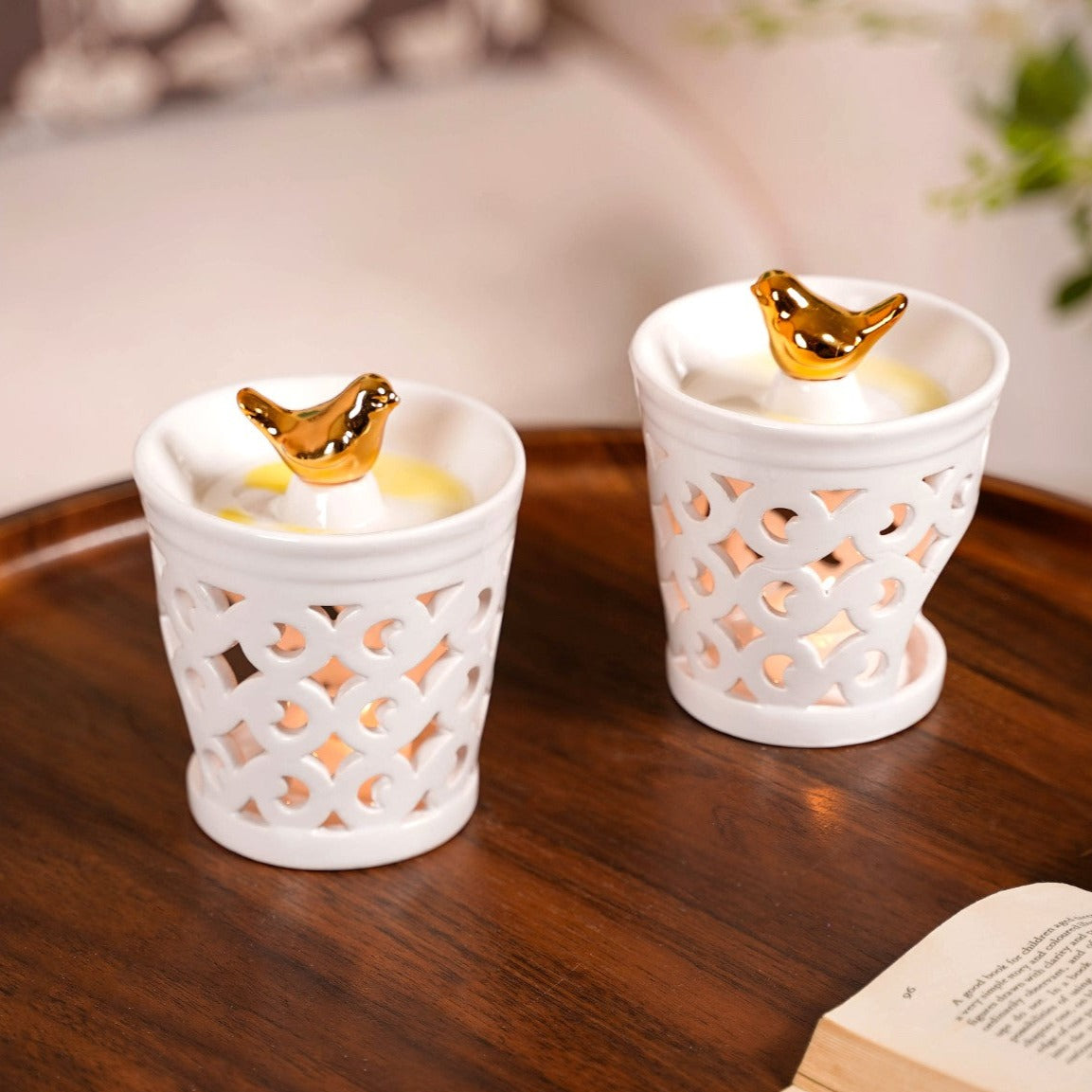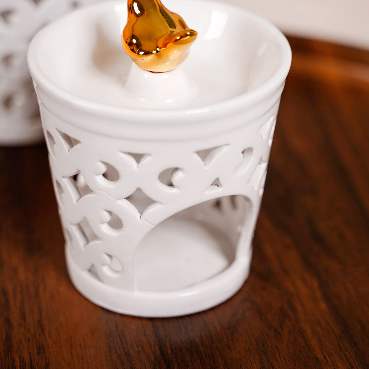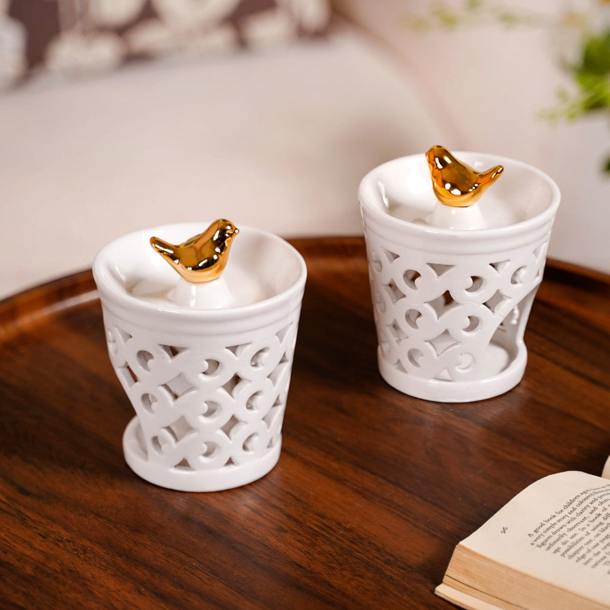 Elevate your festive ambiance with our exquisite lamp holder set featuring a pair of ceramic lanterns in a pristine white hue. Intricate cut-work designs grace the exterior, exuding sophistication. Accented with a golden bird on the lid, these candle holders are perfect for showcasing tealights and diyas. Whether it's Diwali or any celebration, they emit a warm, inviting glow, enveloping your space in enduring allure.