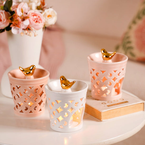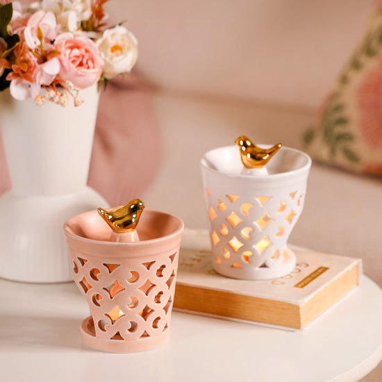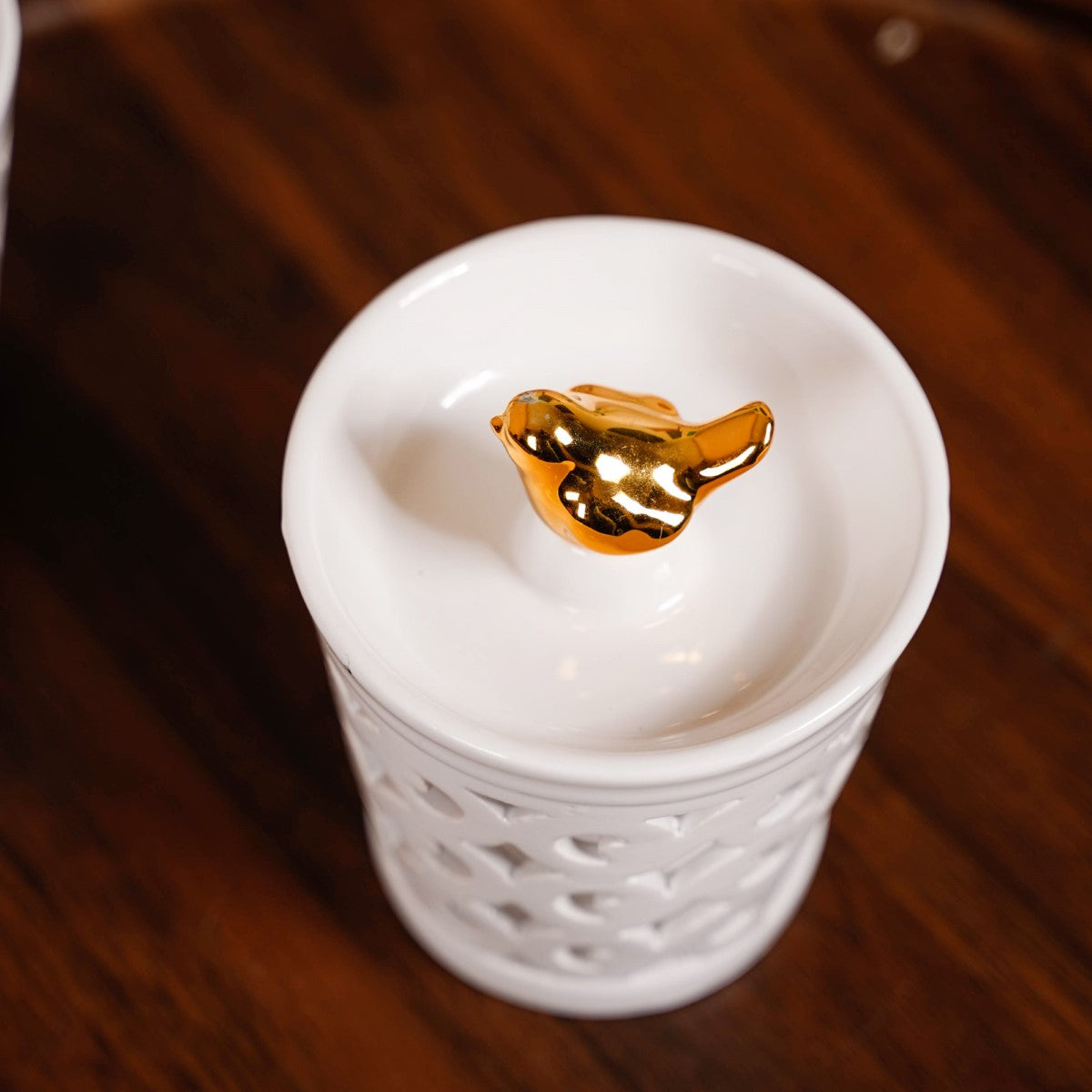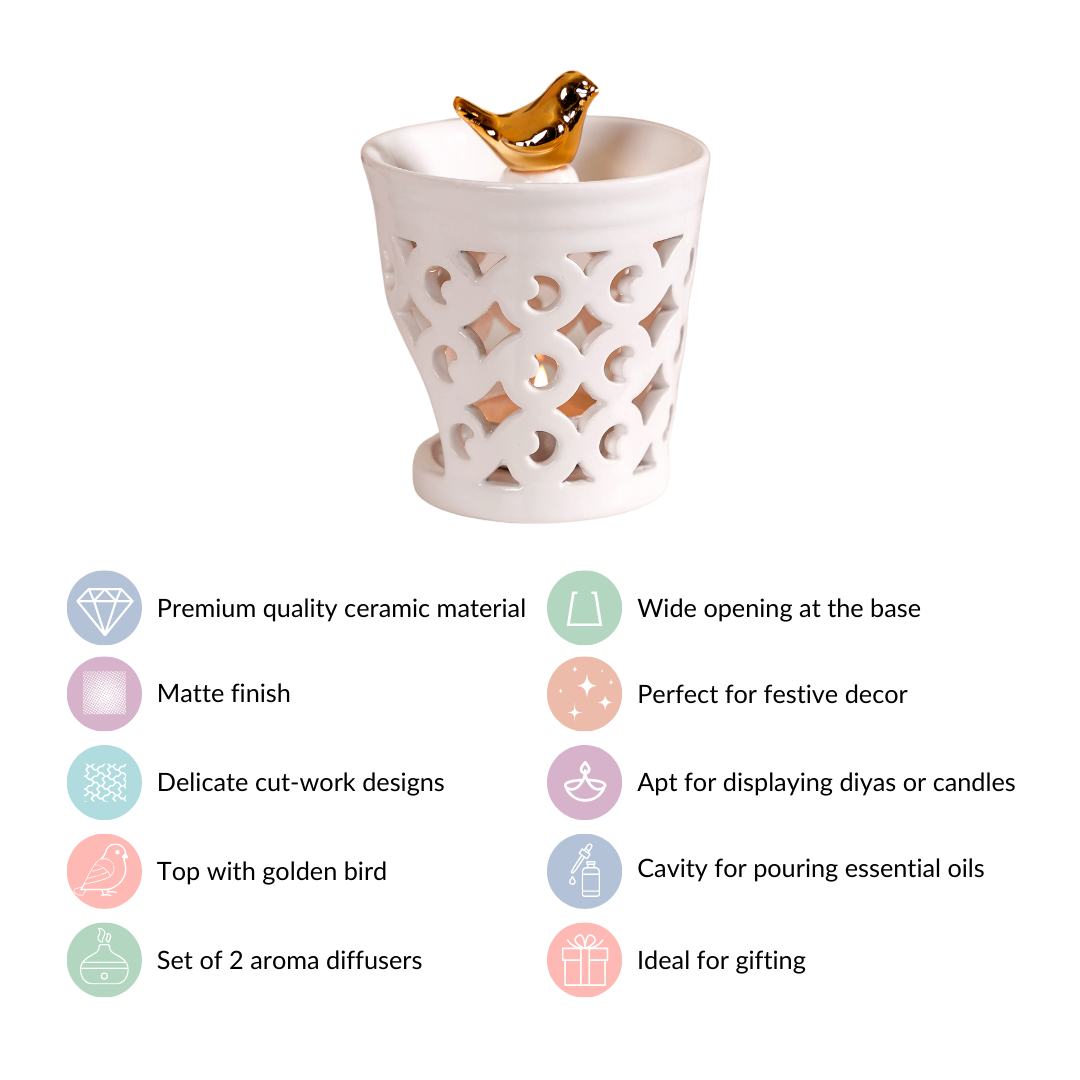Elevate your festive ambiance with our exquisite lamp holder set featuring a pair of ceramic lanterns in a pristine white hue. Intricate cut-work designs grace the exterior, exuding sophistication. Accented with a golden bird on the lid, these candle holders are perfect for showcasing tealights and diyas. Whether it's Diwali or any celebration, they emit a warm, inviting glow, enveloping your space in enduring allure.