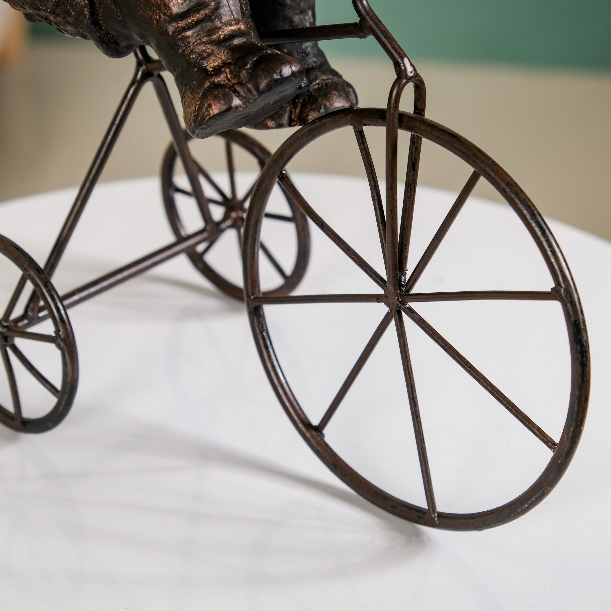 Design: Inject a dose of whimsical charm into your space with this captivating resin art piece. This uniquely sculpted decorative figure features a stately rhino comically balanced atop a classic wire bike. Finished in deep black with subtle bronze accents, this piece of home decor is a bold statement, merging abstract art with playful design. It's the perfect conversation starter for any modern or eclectic interior.