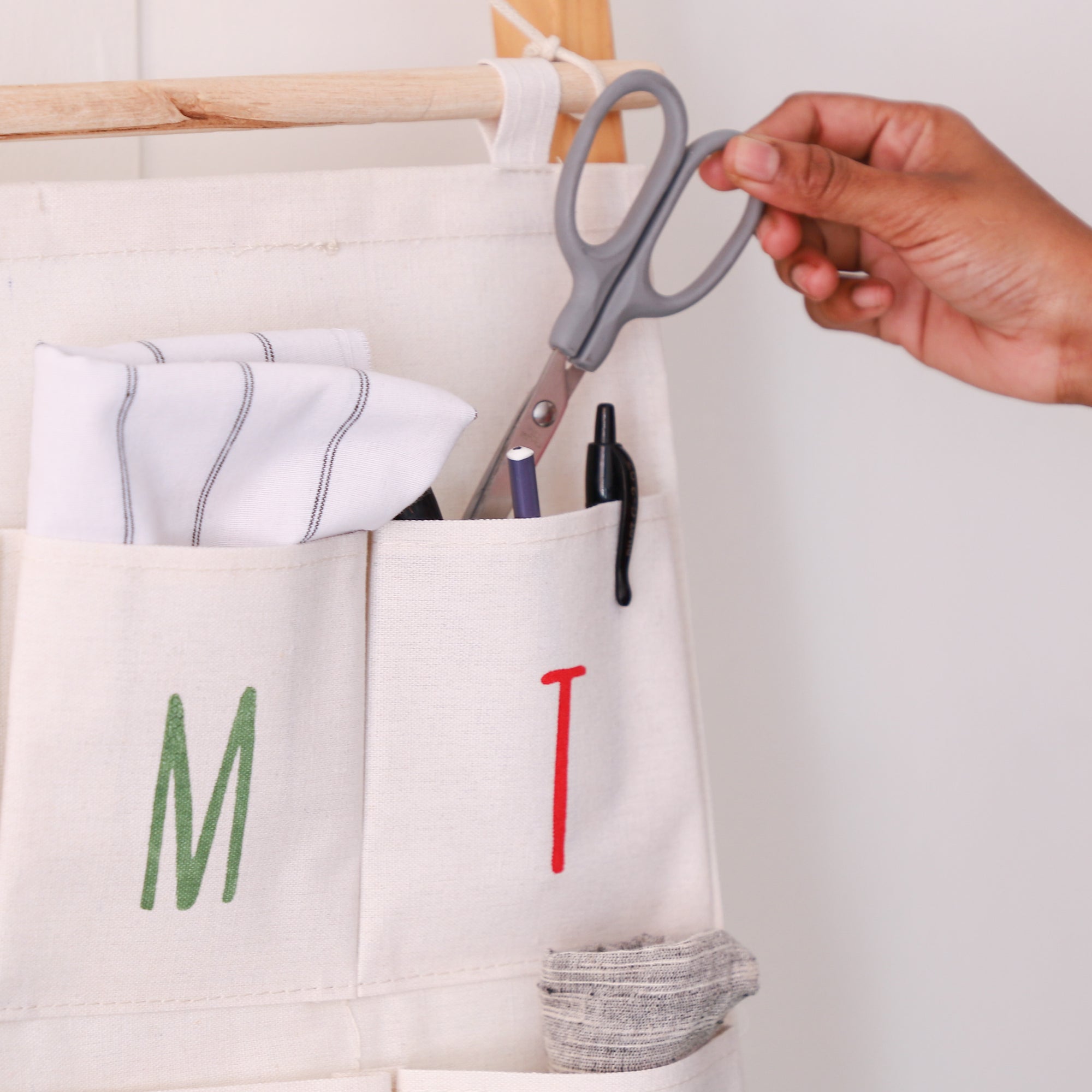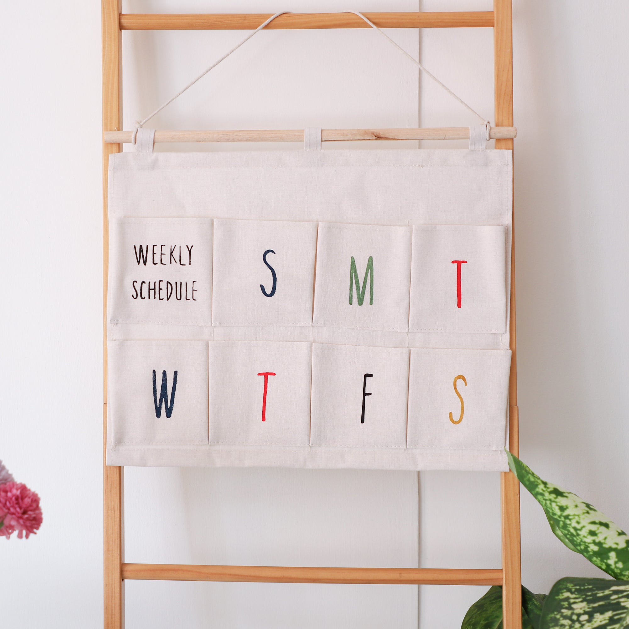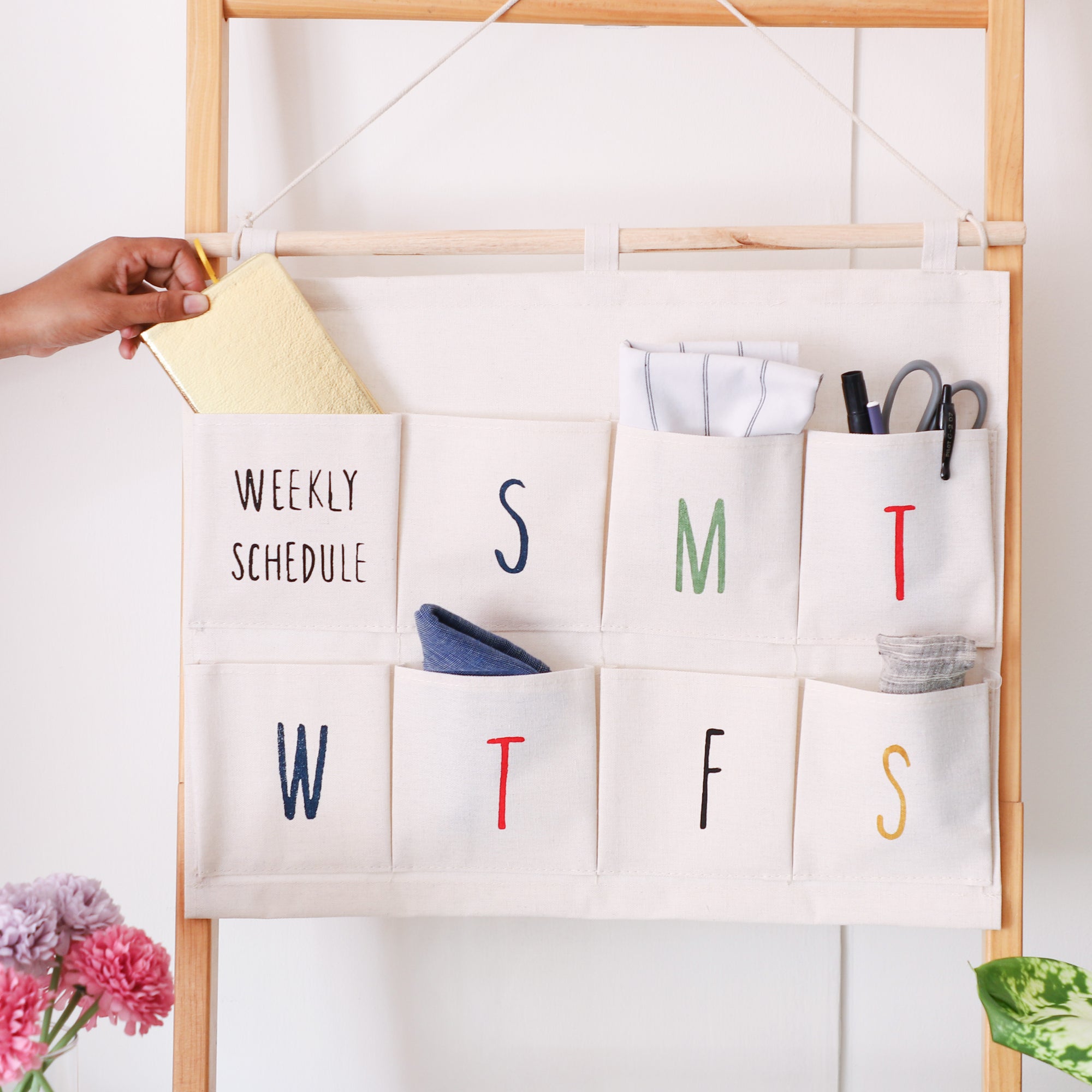 Daily organizer that comes with 8 pockets and has initials of the weekdays printed on 7 of the pockets. The weekly organizer can be used to segregate weekly medicines, notes, stationery or keys. The wooden arrangement at the top of the wall organizer, provides support to the hanging thread and the organizer. The organiser can be wiped or hand washed when required to be cleaned.