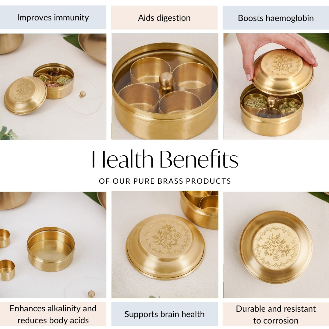 Benefits: Made from 100% pure brass, this mukhwas storage box is both durable and naturally food-safe. The brass surface is coated with a clear lacquer to prevent tarnishing and maintain its lustrous finish. The BPA-free acrylic inner lid provides an added layer of protection without compromising on safety.