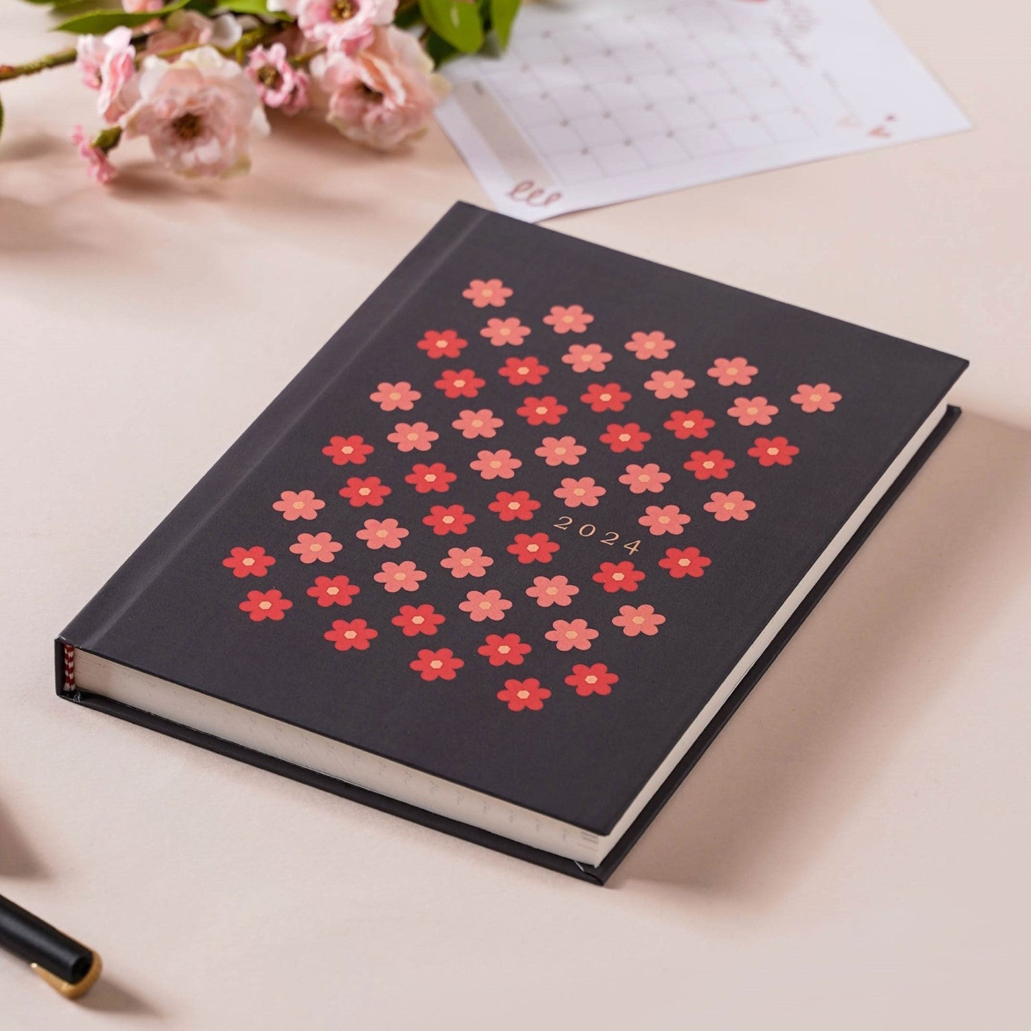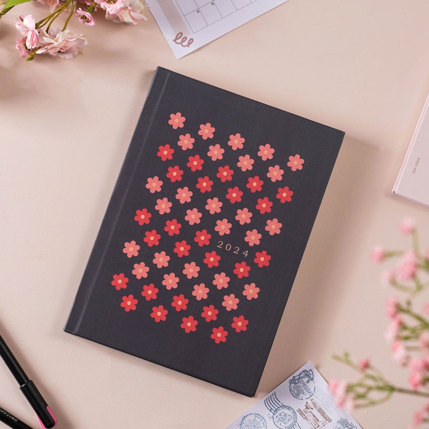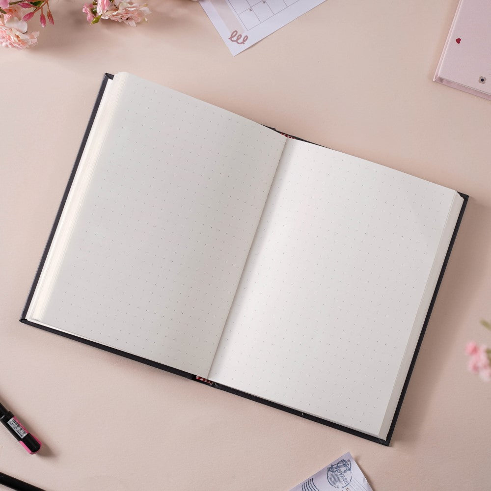 The hardbound notebook with a black matte laminated cover is adorned by little blossoms in pink and red colour. The diary can also be used as a journal to keep a track of day-to-day activities of the upcoming year, 2024. The diary is suitable to be carried as a travel journal, record book, or office diary. It consists of 104 pages- 34 ruled, and 34 pages with dots. The pages with dots can be utilised as weekly planners, while the ruled ones can be used to keep a track of important notes. The hardbound diary is a must-buy for its premium quality, naturally shaded 90gsm pages and quirky patterning. It's a perfect gift for children and adults, colleagues and friends for every occasion.