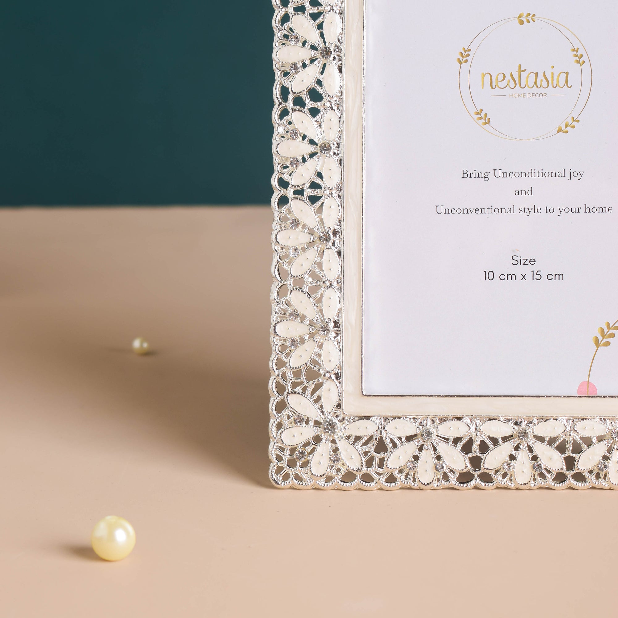 Design: The frame features a beautiful aesthetic defined by intricate silver and white floral engravings and a high-sheen gloss finish. Its sleek rectangular shape is visually stunning and attractive. Your photo is protected by a transparent acrylic photo frame set within a metal rim. The entire frame is backed by a sturdy back stand with a black velvet coating stabilised by a satin cord for secure tabletop display.
