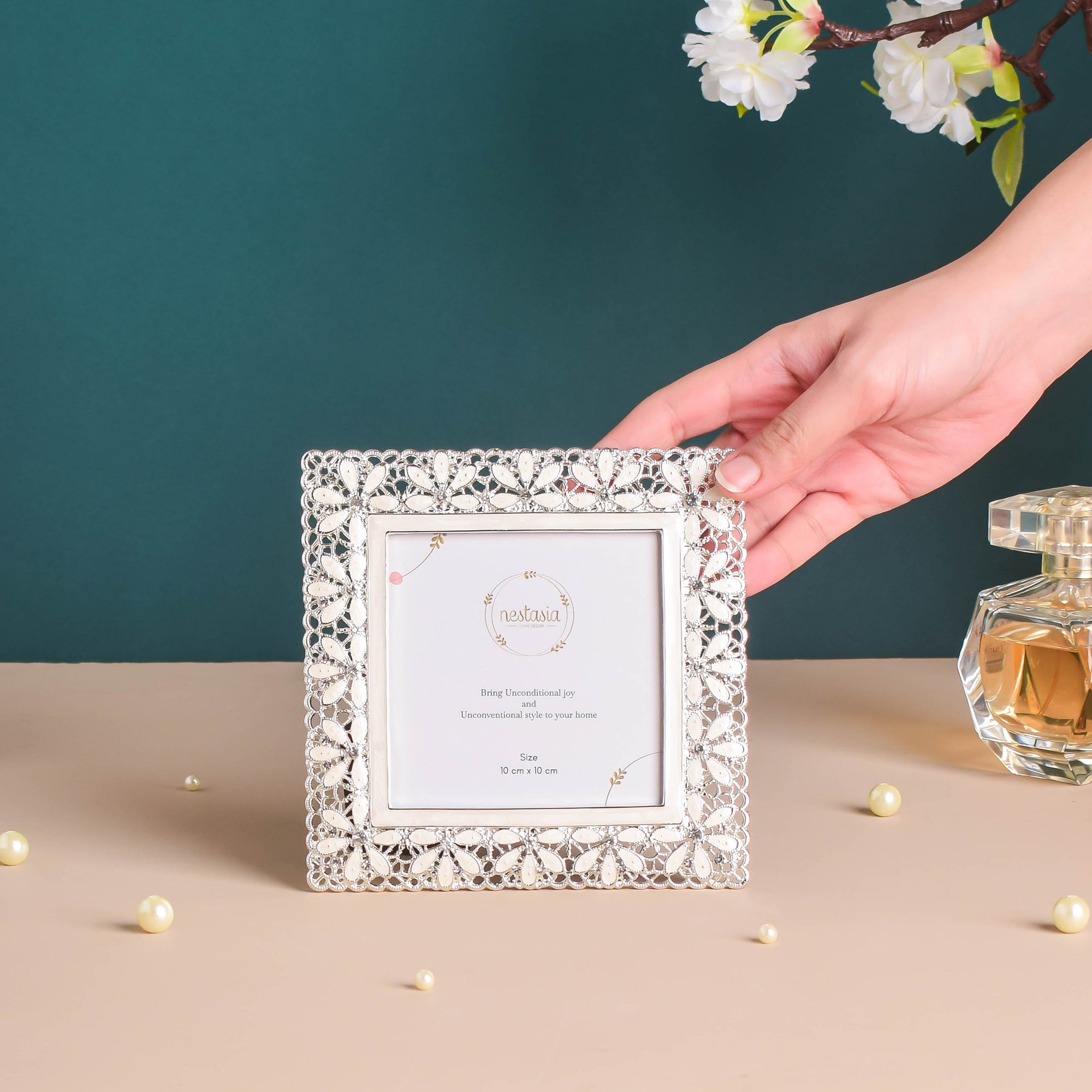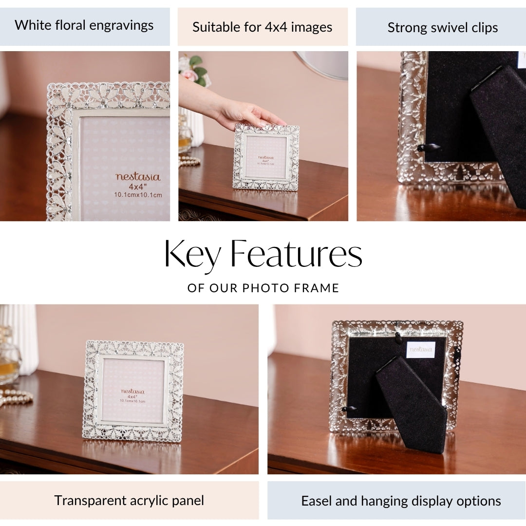 Design: Adorn your home with this beautiful frame, featuring lustrous silver details and intricate floral engravings for a luxurious look. The sleek square shape and high-sheen gloss finish make it a standout accessory. Your photo is secured by a transparent acrylic photo frame set within a metal rim, all built into a sturdy frame that embodies quality craftsmanship and style. This frame is perfect for displaying 4x4" photos.