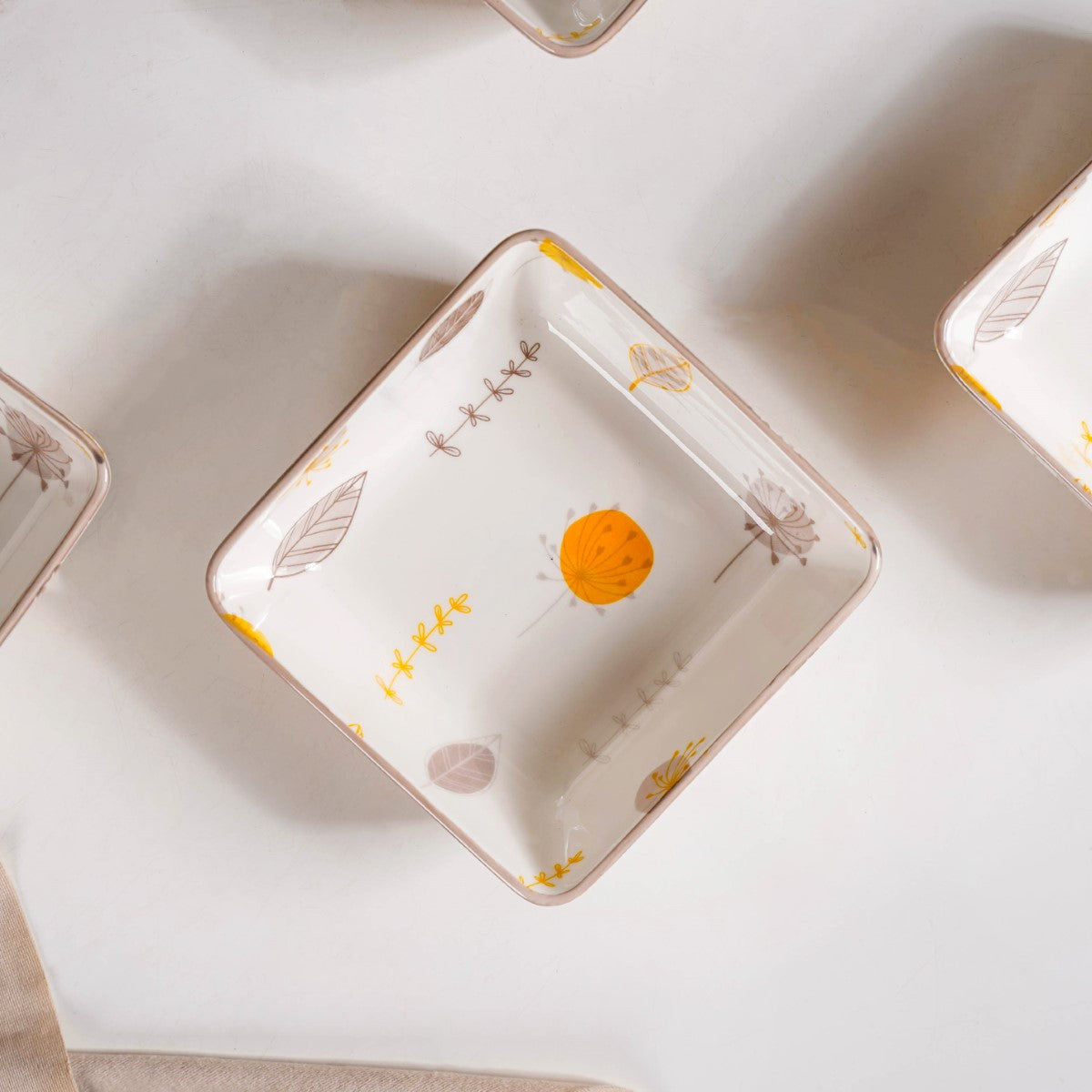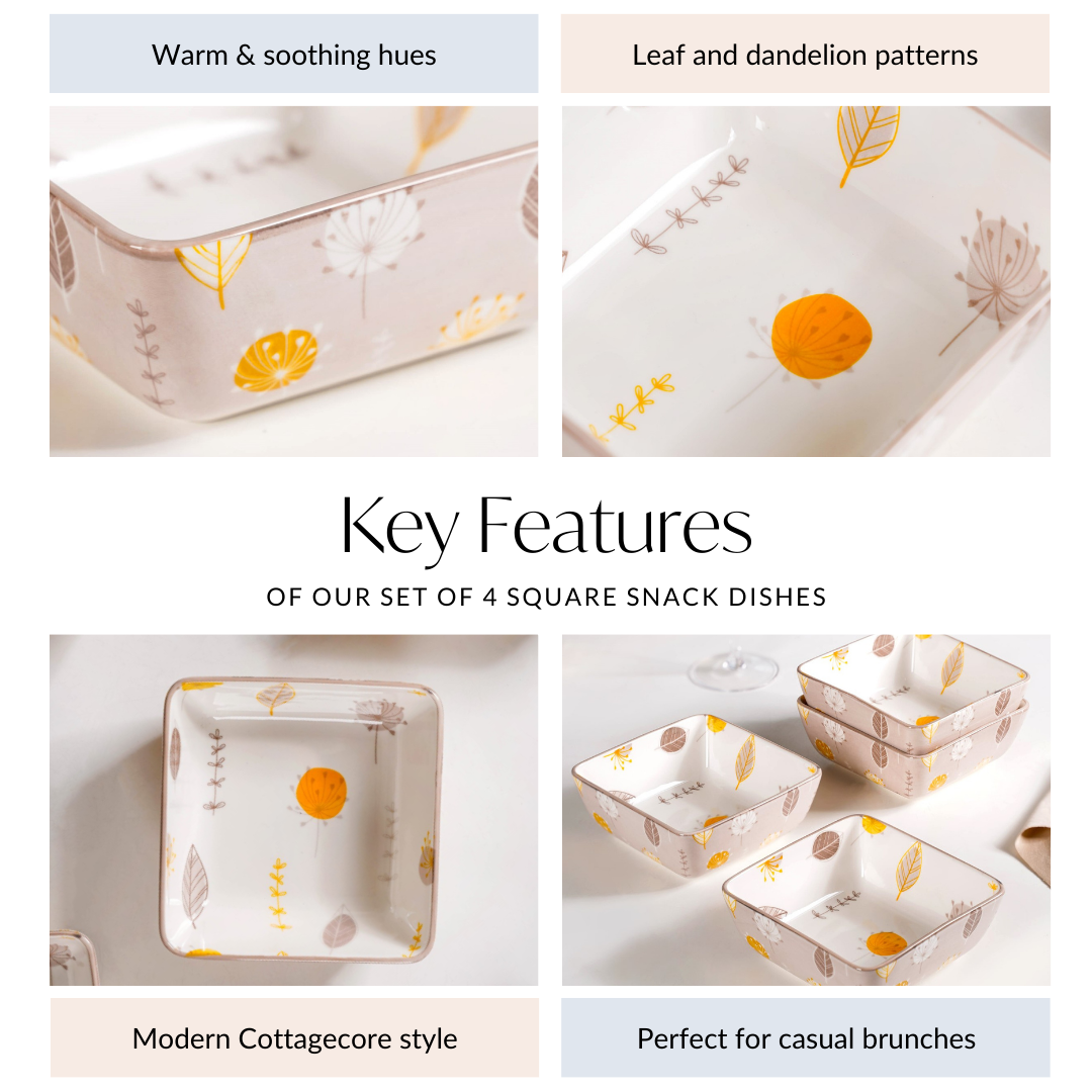 Indulge in delightful snacking experiences with our set of 4 square snack dishes, exuding charm with their modern Cottagecore style. Crafted from 100% food-safe ceramic, meeting international food-grade standards, they promise safety with every use. Lead-free and non-toxic, they're microwave- and dishwasher-safe for convenient heating and cleaning. Adorned with tranquil leaf and dandelion patterns in warm hues, they create a soothing ambience. Perfect for casual brunches or intimate gatherings, these snack dishes elevate your culinary presentation effortlessly. Embrace the joy of sharing and gifting with these exquisite additions to your kitchenware collection. Enjoy the blend of functionality and aesthetic appeal!