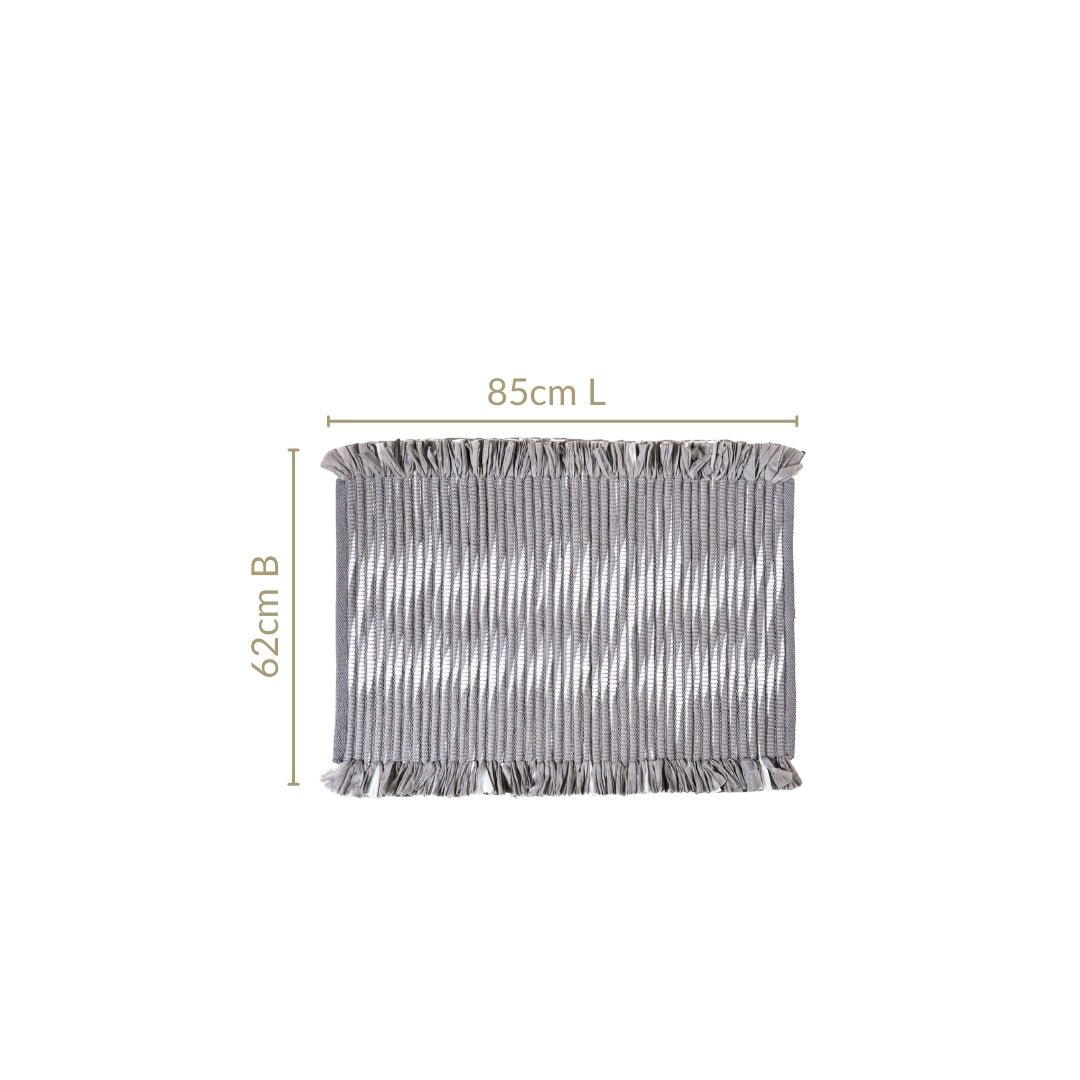 Design: This floor mat is a stylish addition to any room, featuring a beautifully textured ribbed weave that adds depth and visual interest. The deep anthracite color evokes a sense of calming sophistication. At the same time, the linear raised detailing, crafted from upcycled rope, creates a tactile and visually appealing pattern that is pleasant to walk on. The fabric fringes on both ends add a touch of relaxed charm and complement a wide range of interior styles, from sleek modern designs to cozy rustic retreats. This makes it a versatile choice for any home.