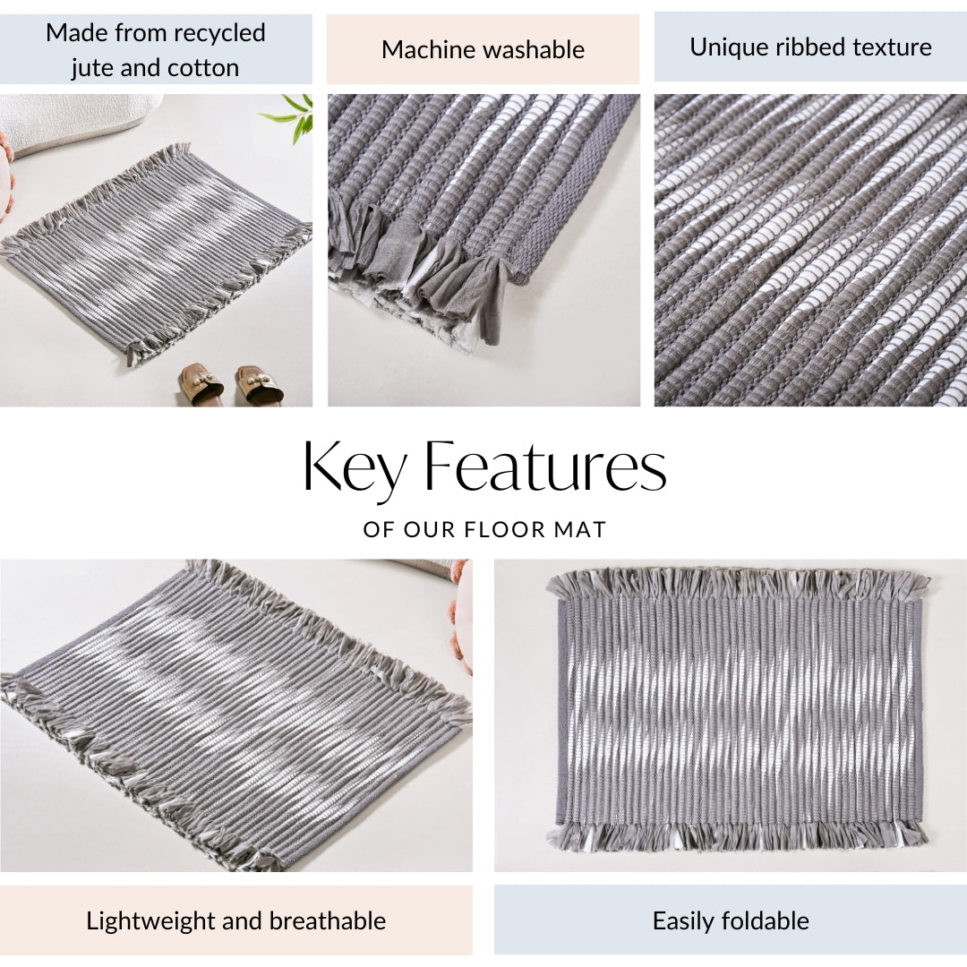 Benefits: This floor mat is crafted from eco-friendly recycled polyester and cotton, featuring a unique ribbed texture with raised detailing made from upcycled rope, and boasting a durable construction that provides both breathable comfort and long-lasting durability, all while being effortlessly maintained with its machine-washable design.