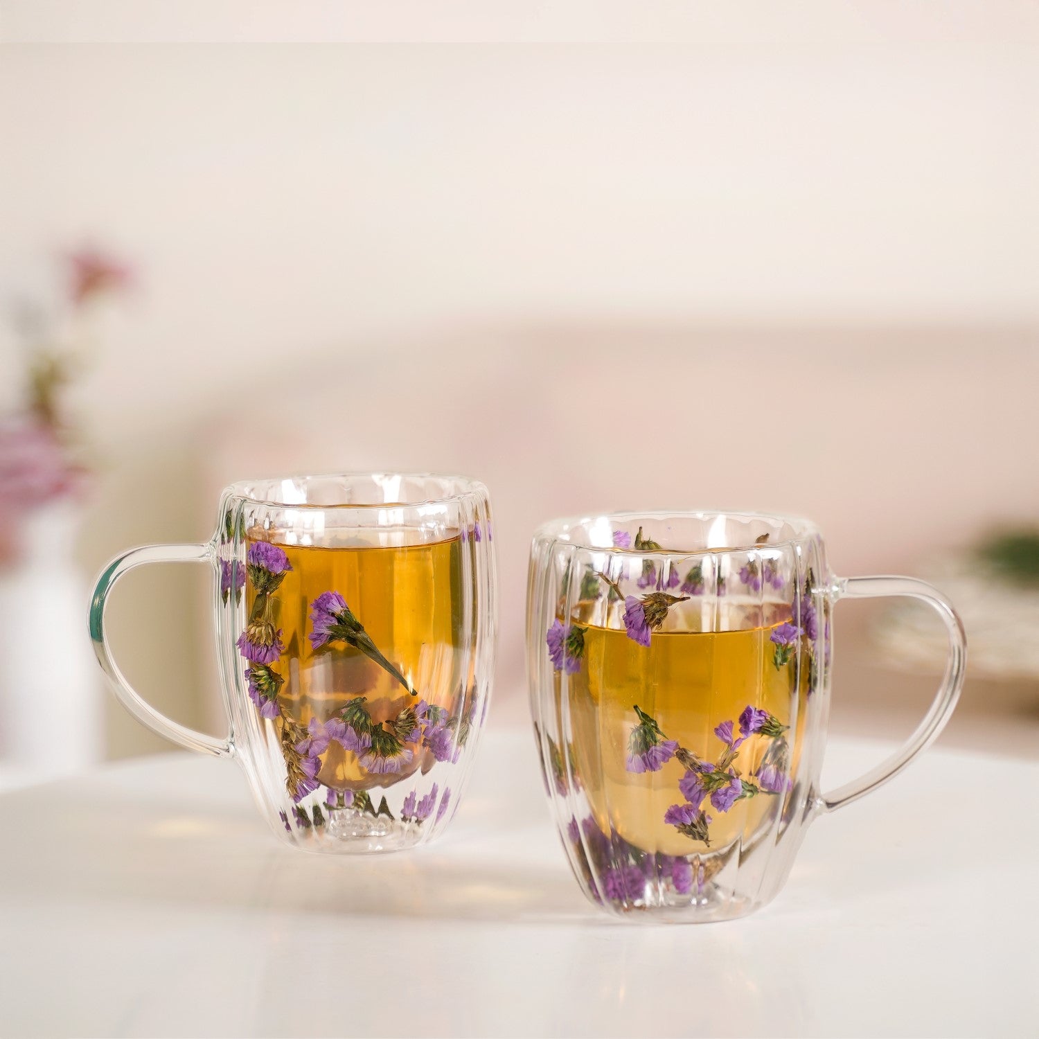 Design: Crafted from transparent borosilicate glass, this tall double-walled mug set features organic violet flowers gracefully encased between its clear layers. A ribbed inner chamber adds visual texture, while the ergonomic handle completes the refined silhouette. Beautifully presented in an elegant gift box, it’s thoughtfully designed to make a lasting impression.