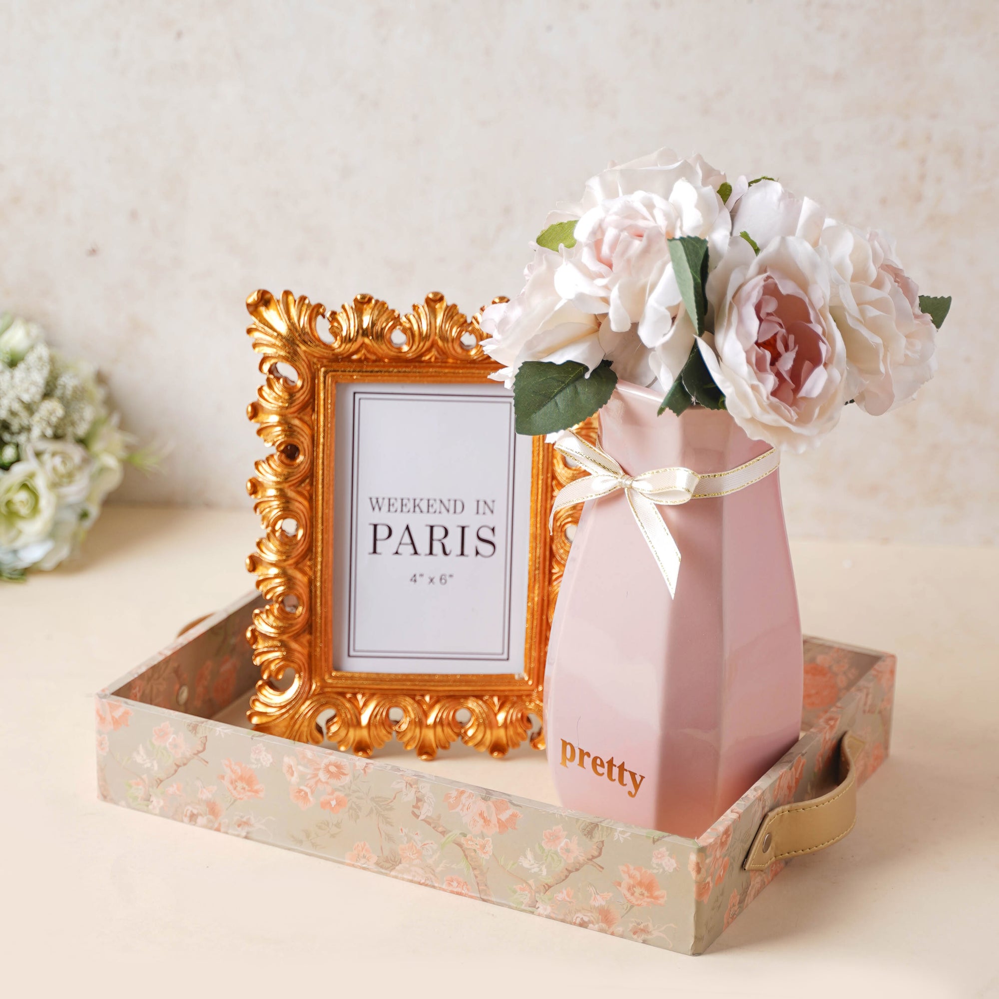 A Decorina or Decorholic can truly appreciate a hamper like this with a vintage tray, a dusty rose pink vase and a vintage frame with complete a set and a decorate a corner.