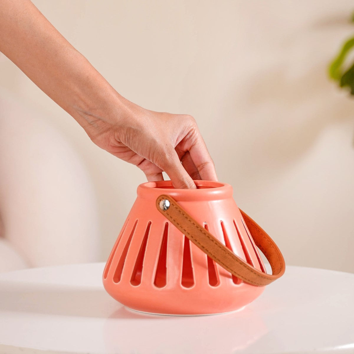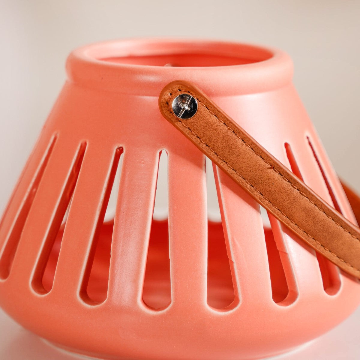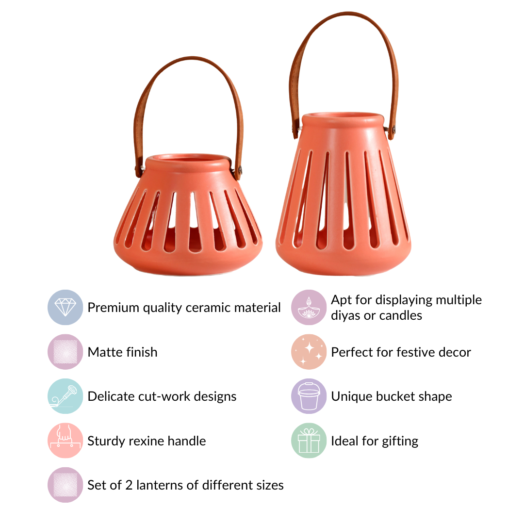 Elevate your festive home decor with our exquisite peach ceramic lantern set. This set includes two distinct-sized lanterns, adorned with intricately carved cutwork designs that exude sophistication. The rich brown rexine leather handles not only offer a stylish contrast but also shape the lanterns uniquely. The broad-mouthed short candle stand accommodates several diyas or candles, while the versatile tall stand can hold both traditional diyas and pillar candles. Whether it's Diwali or any joyful occasion, these lanterns emit a warm, inviting glow, enveloping your space in a traditional charm.