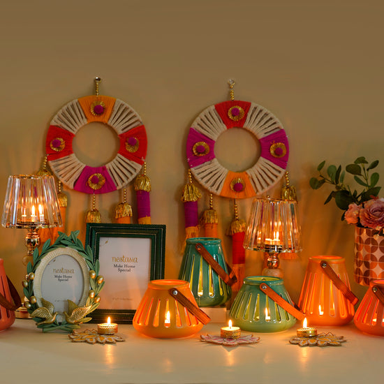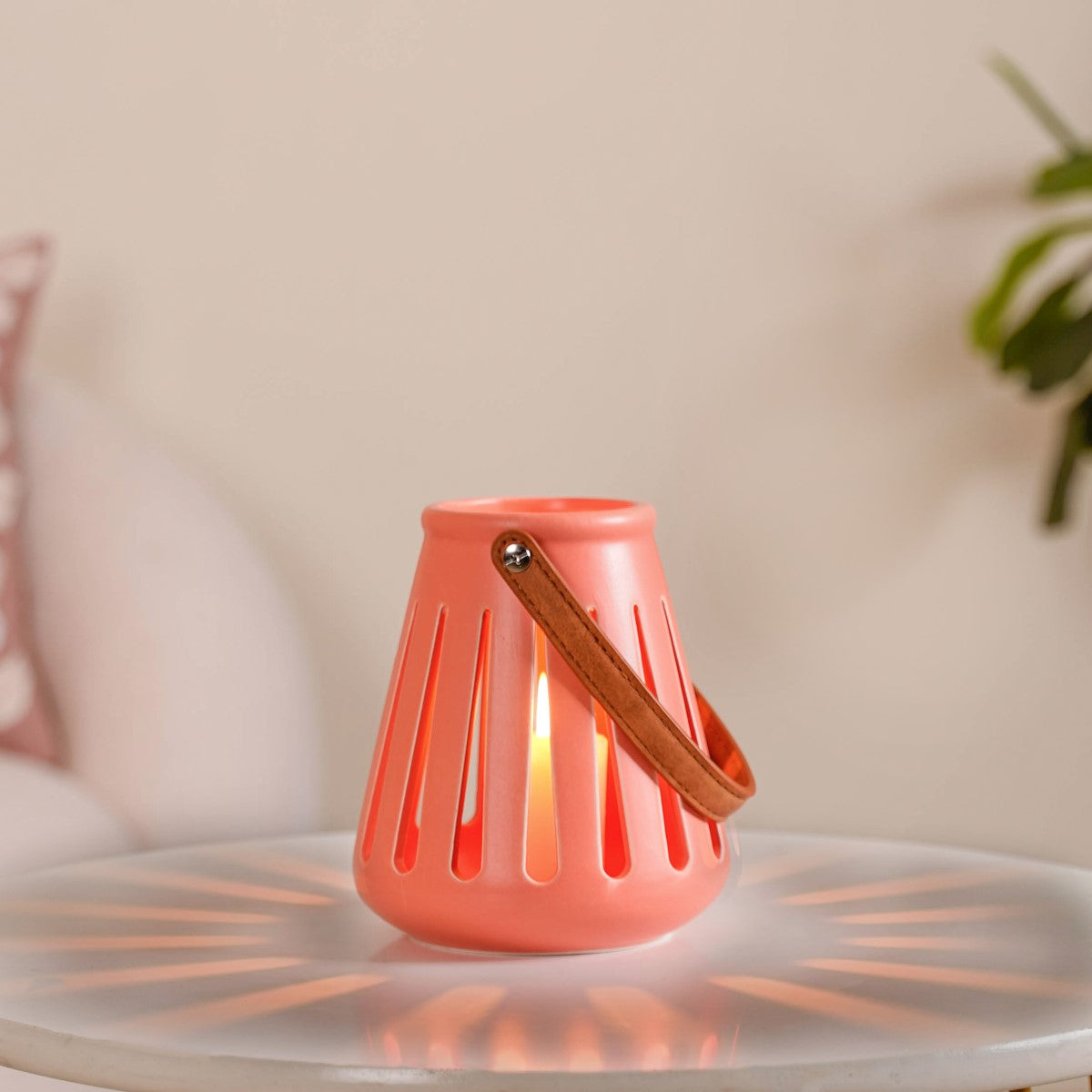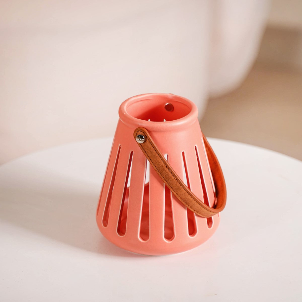 Elevate your festive home decor with our exquisite peach ceramic lantern set. This set includes two distinct-sized lanterns, adorned with intricately carved cutwork designs that exude sophistication. The rich brown rexine leather handles not only offer a stylish contrast but also shape the lanterns uniquely. The broad-mouthed short candle stand accommodates several diyas or candles, while the versatile tall stand can hold both traditional diyas and pillar candles. Whether it's Diwali or any joyful occasion, these lanterns emit a warm, inviting glow, enveloping your space in a traditional charm.
