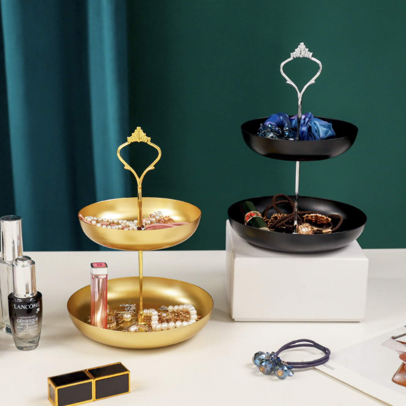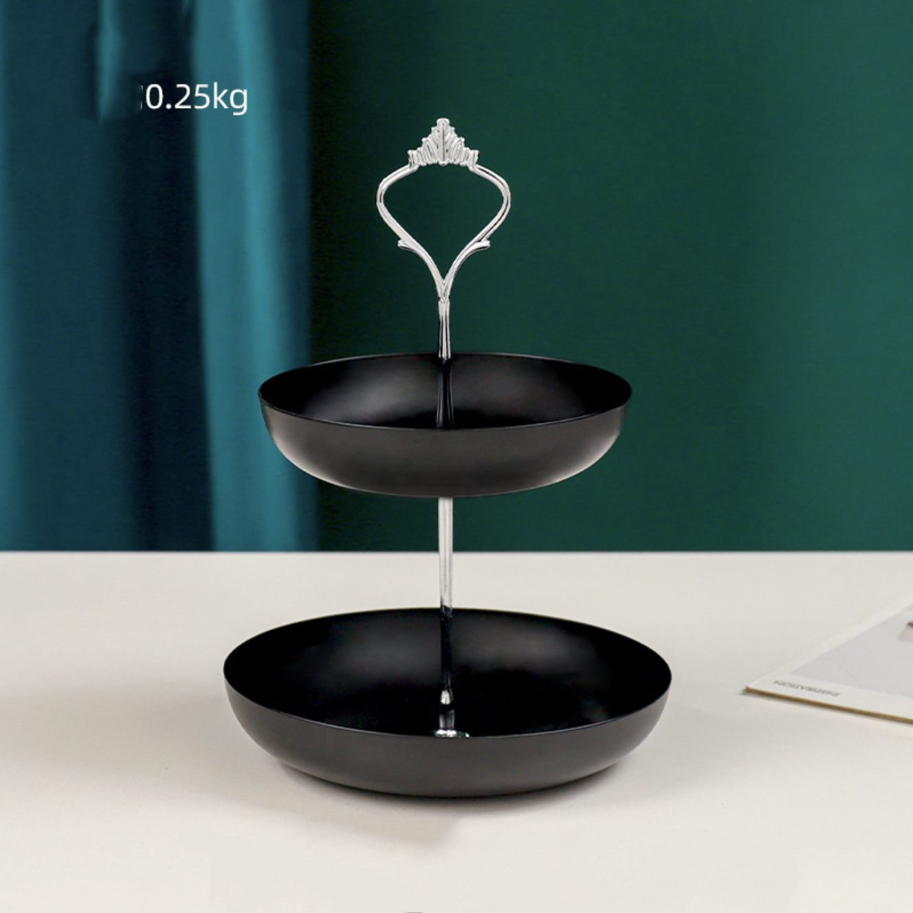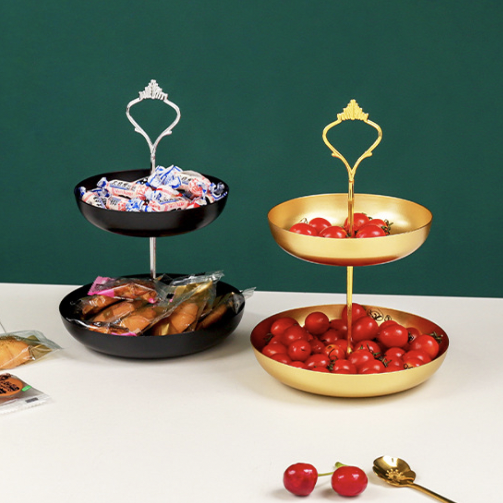 Perfect for festivals, the two storey plate tray stand is the best decor and storage accessory to have around the house. The tarnished finish on the double-tiered metal tray is ideal for serving everything from drinks to snacks.  The decorative plates are made of high-quality metal which is longlasting and sturdy.  Cleaning the festive decor beautiful plates with a gentle sponge is recommended. When the ornamental tray isn't being utilised for festive decorating, put ordinary items on it such as trinkets, medicines, candies and so on. The two-tier platter tray is best used for dry decorations, such as food or other festive decorations. Available in two colors - gold and black to select from.