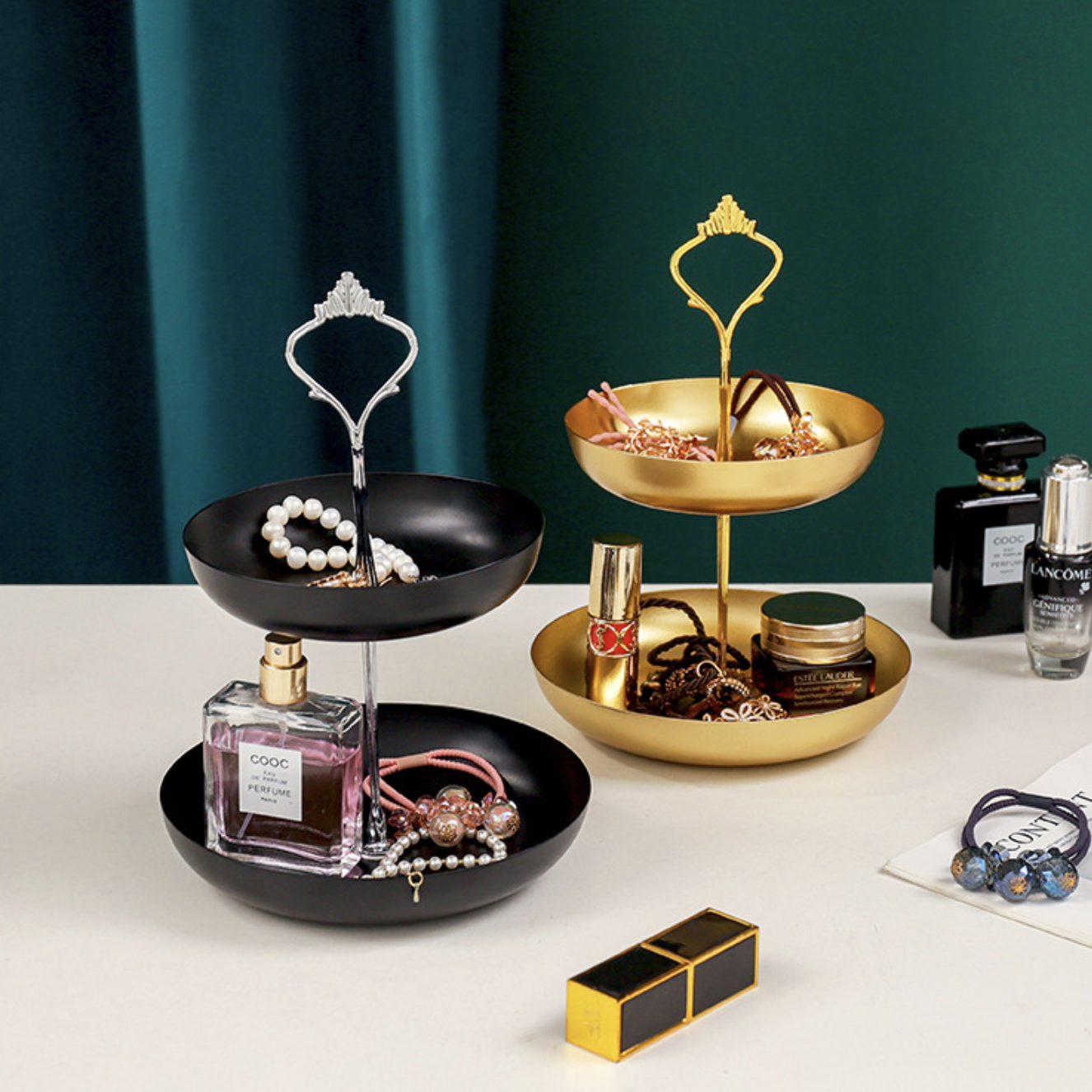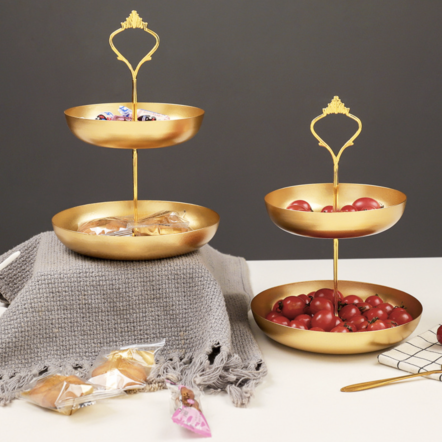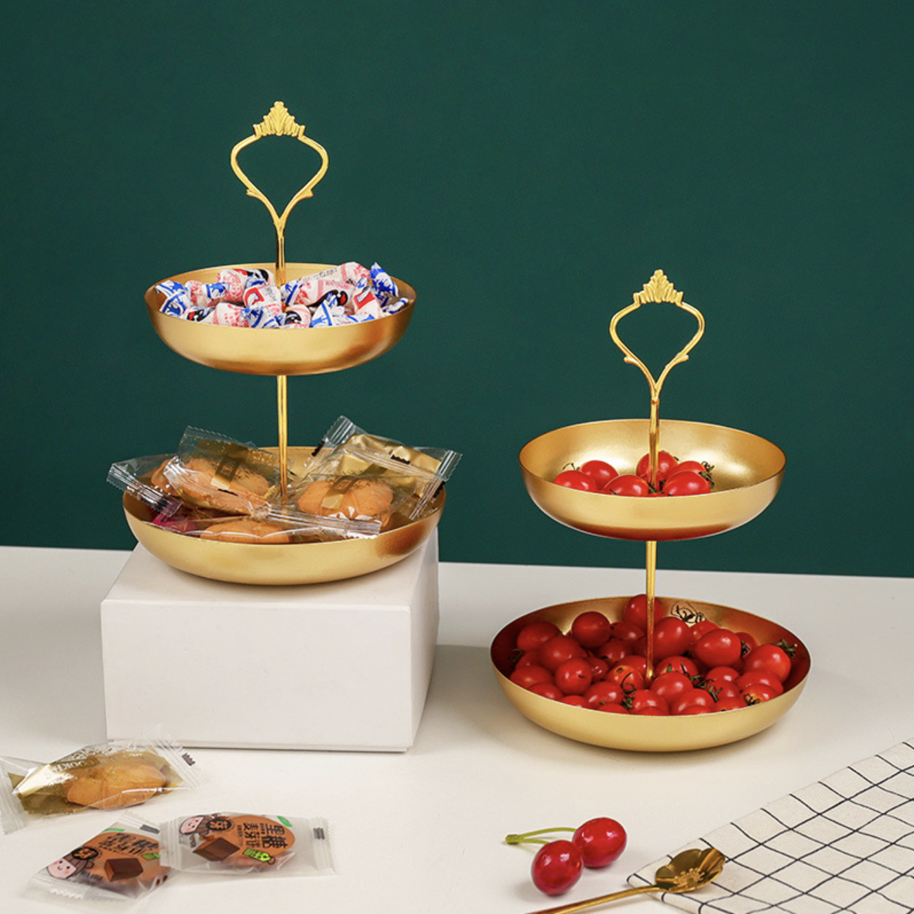Perfect for festivals, the two storey plate tray stand is the best decor and storage accessory to have around the house. The tarnished finish on the double-tiered metal tray is ideal for serving everything from drinks to snacks.  The decorative plates are made of high-quality metal which is longlasting and sturdy.  Cleaning the festive decor beautiful plates with a gentle sponge is recommended. When the ornamental tray isn't being utilised for festive decorating, put ordinary items on it such as trinkets, medicines, candies and so on. The two-tier platter tray is best used for dry decorations, such as food or other festive decorations. Available in two colors - gold and black to select from.