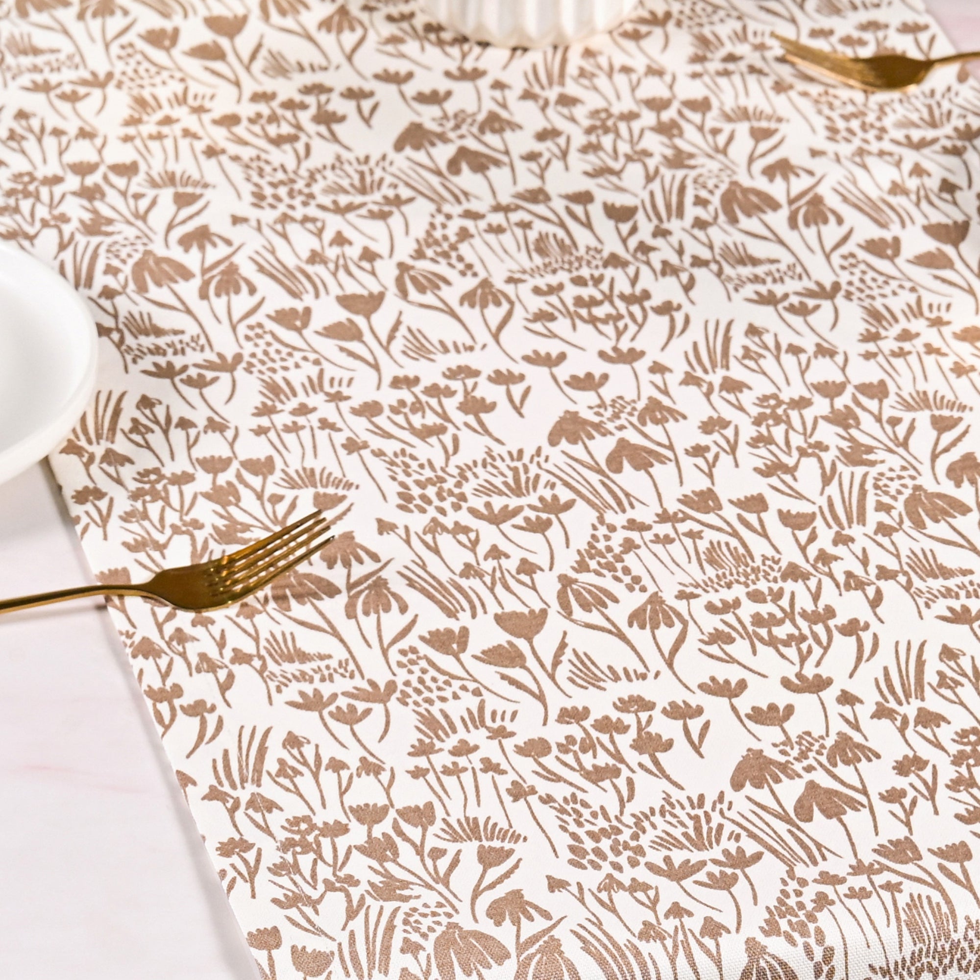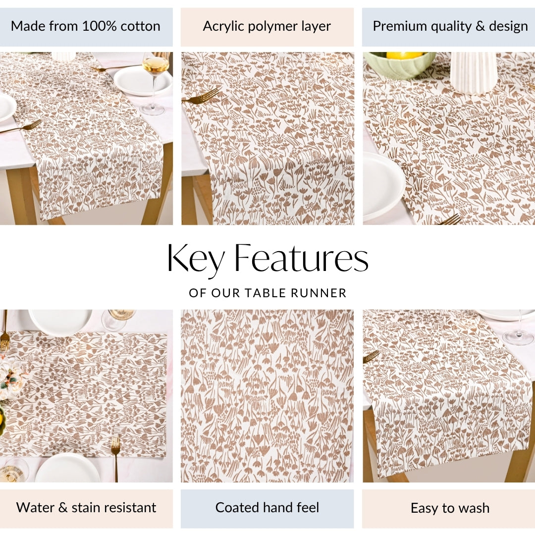 Design: Bring a touch of nature to your table with this cotton table runner, adorned with subtle wildflowers and leafy accents in off-white and earthy brown. The off-white base highlights the flowers very vividly and creates an enchanting visual depth. Be it a formal party or a luncheon with your friends, this runner makes everything look pretty!