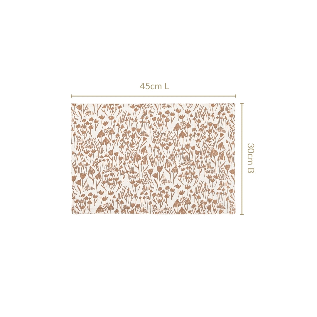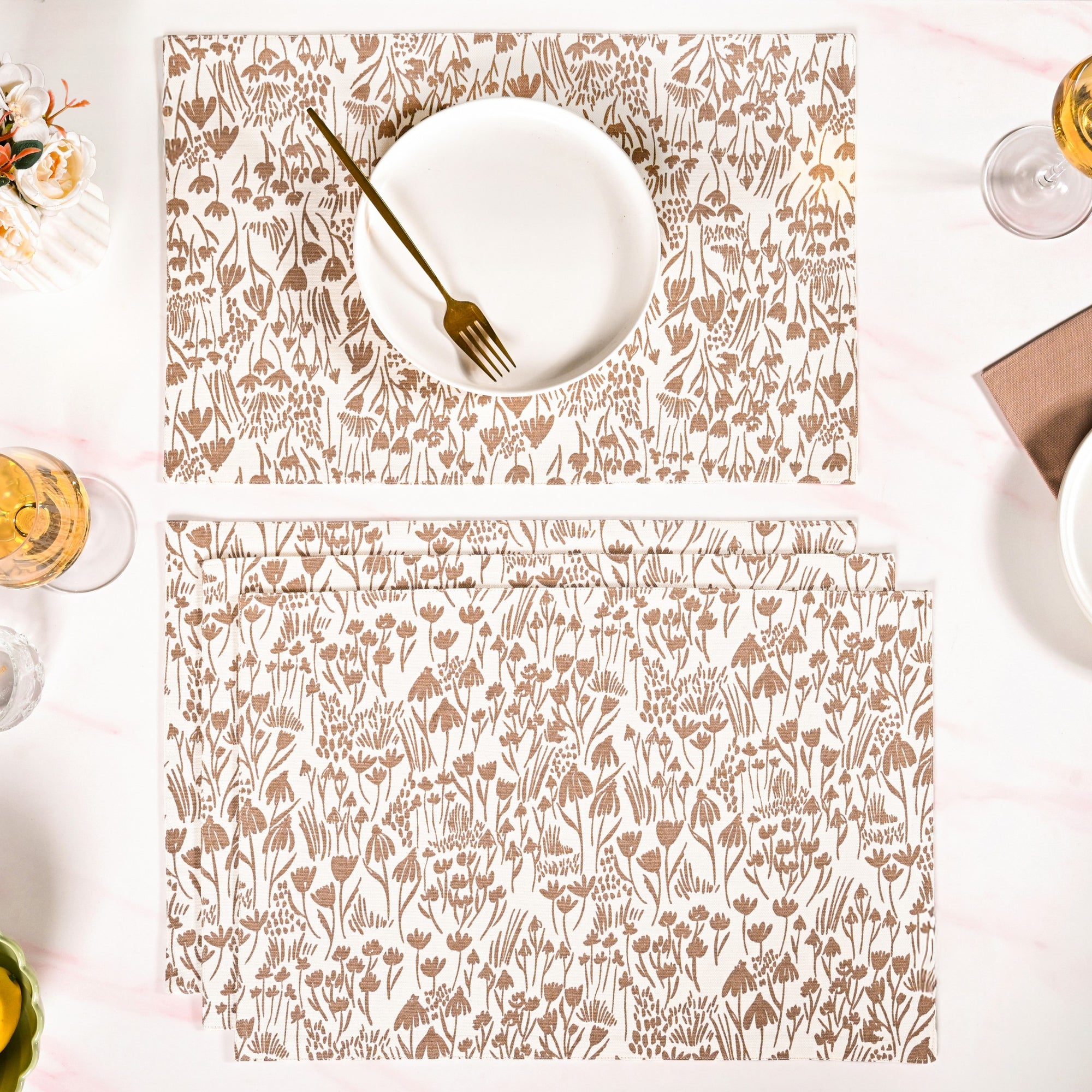 Design: This 100% cotton table mat set flaunts a calming botanical design with dainty wildflowers and leafy sprigs in soothing, earthy shades of off-white and brown. Set on a neutral beige backdrop, the minimal floral pattern brings a rustic yet elegant vibe to your table. The hand-drawn detailing lends it an artisanal charm, making it a perfect fit for both modern and countryside-inspired dining spaces.