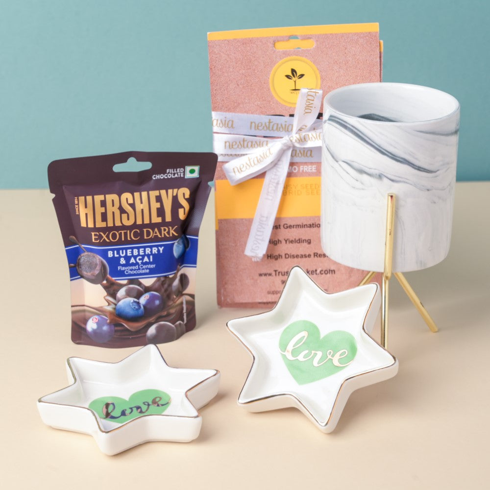 For your other corners, keep the zinnia mixed seeds (hybrid) and daisy seeds (hybrid) planted in designed planters on the windowsill. Enjoy the festive evening with the sweet treats of Hershey's exotic dark blueberry and acai chocolates. The hamper is not returnable.