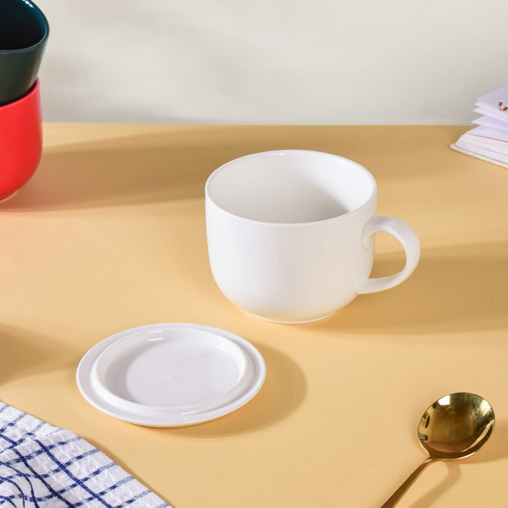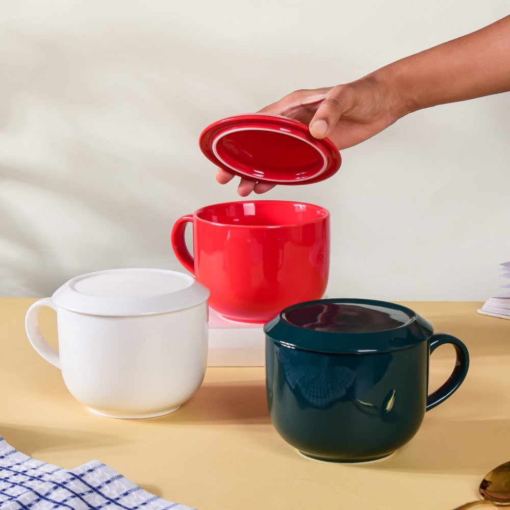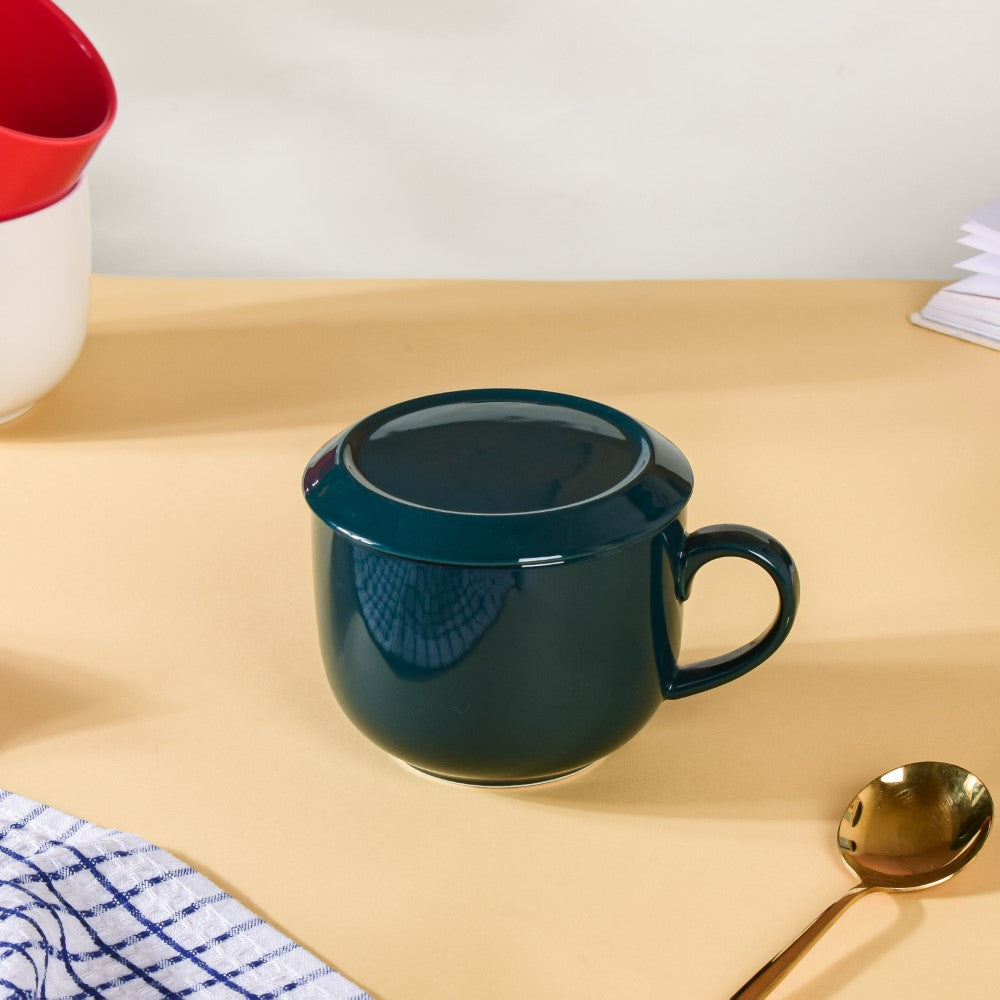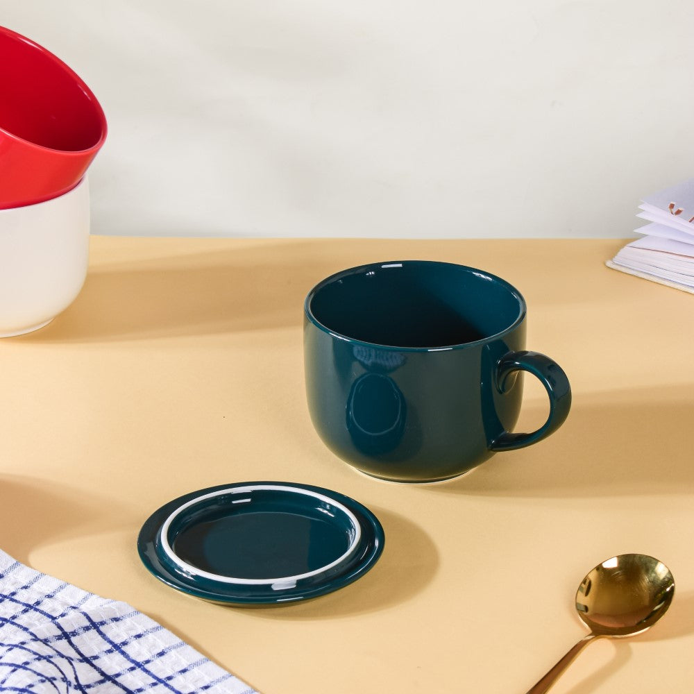 A mug with lid made of ceramic that is a dessert cup with lid of the same colour that comes in variants of dark green and red. The cups can be used to serve warm drinks like hot chocolates or even soups. The cups also be used to serve some delicious desserts like fruit cream or mug cake and are apt as a breakfast bowl or cereal bowl to enjoy cornflakes or porridge. The lid of the cup complements the cup and can also be used as a coaster. It helps to keep the food inside the cup warm.