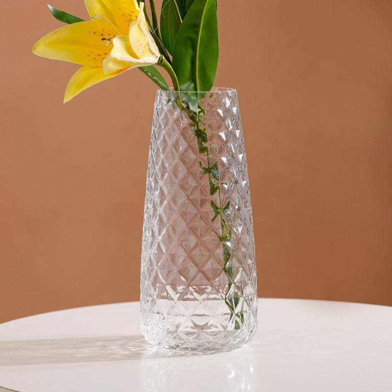 The glass vase has been crafted by skilled artisans to be a stunning decor accent with a contemporary element and versatile translucent colour. The diamond cut-glass textures on the surface of the flower vase give the glass vase an exquisite crystal form. The understated yet sophisticated form of the glass vase exudes true elegance to beautify the home decor. Whether placed in a living room, bedroom, or corner table, the vase is sure to elevate the ambience of any space with its modern flair. The glass vase integrates modern design features in shape, colour, and texture. The design is inspired by nature and the splendour of its gift of diamonds.
