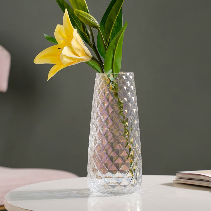 The glass vase features glass-cut textures and a unique colour-changing iridescent finish to create a beautiful display of flowers. The glass vase will perfectly accentuate any space with its elegant form, while the flower vase's handy form enables ease in moving and changing the placement of the vase. The translucent glass will ensure that the flowers placed in it are highlighted. Place the vase as a centrepiece on the table or place it on the corner table near a sofa to enhance how the interior looks. Inspired by nature and its opulence in its gift of diamonds, the glass vase incorporates contemporary design elements in form along with an iridescent tint sparkling like the rays of the sun.