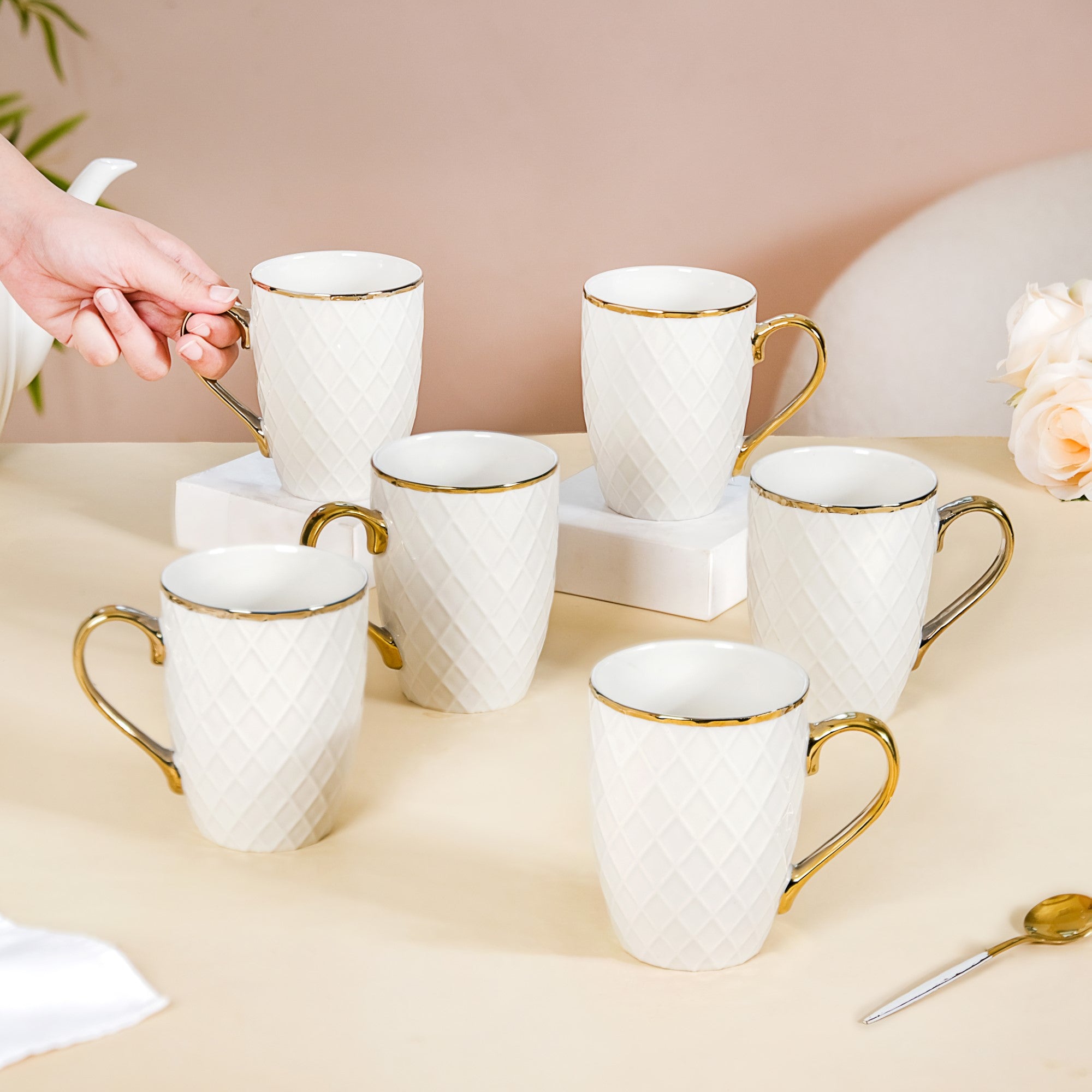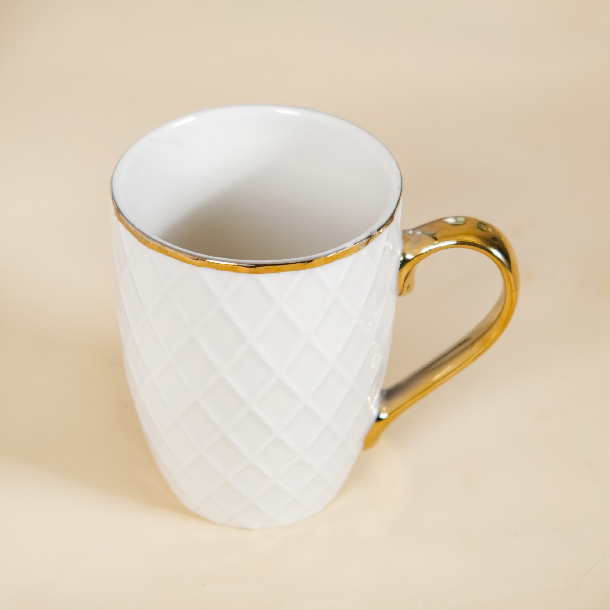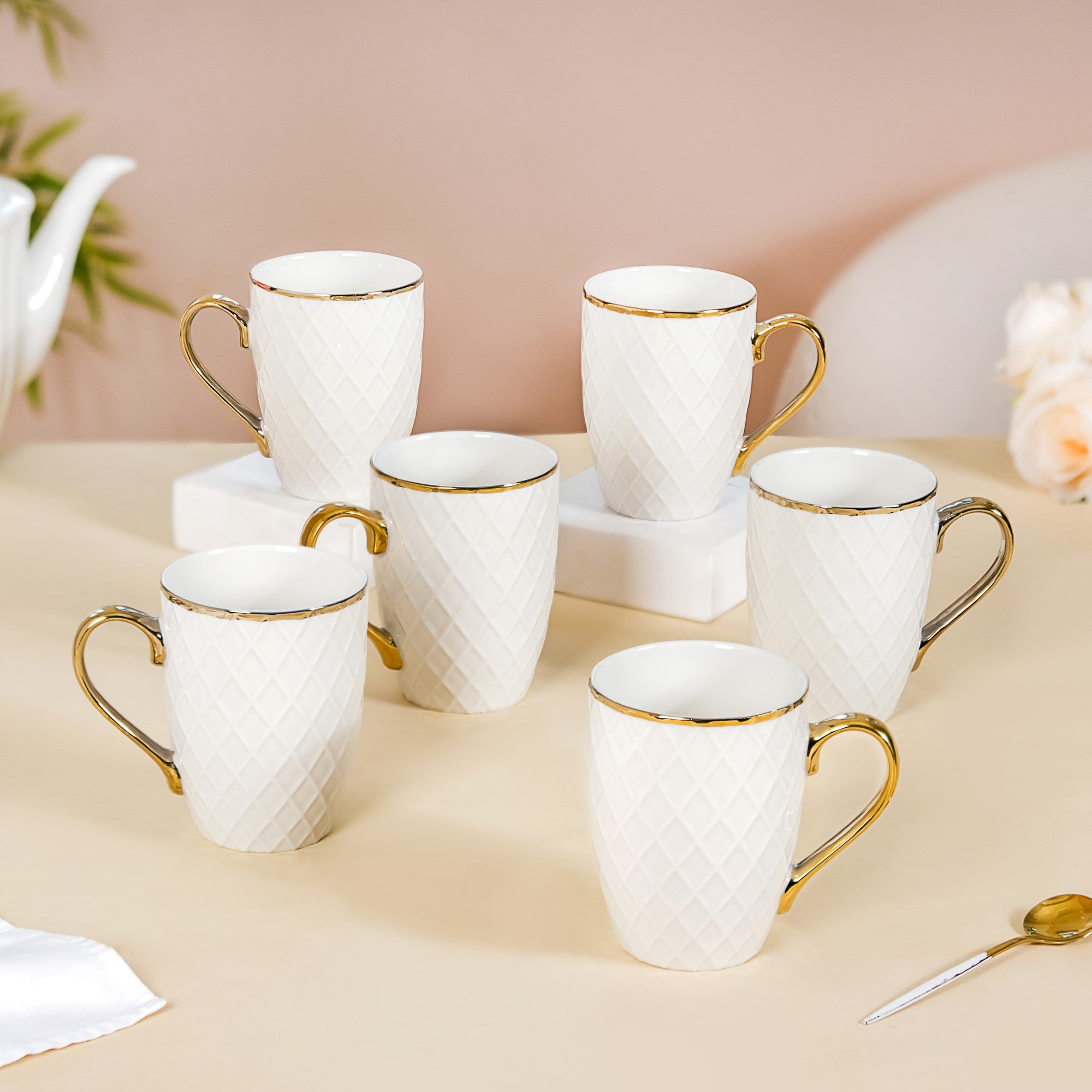 Our ceramic cup set includes a complete set of six teacups. This means you will receive six identical cups, allowing you to cater to your family and guests when hosting gatherings or enjoying a cozy tea time with loved ones. Each cup within the set features the same elegant design. The exterior of these ceramic teacups showcases intricate diamond-textured patterns on a pristine white background, complemented by a gleaming golden rim and a sturdy C-shaped handle finished in radiant gold. This uniform design adds a touch of sophistication to your collection.
